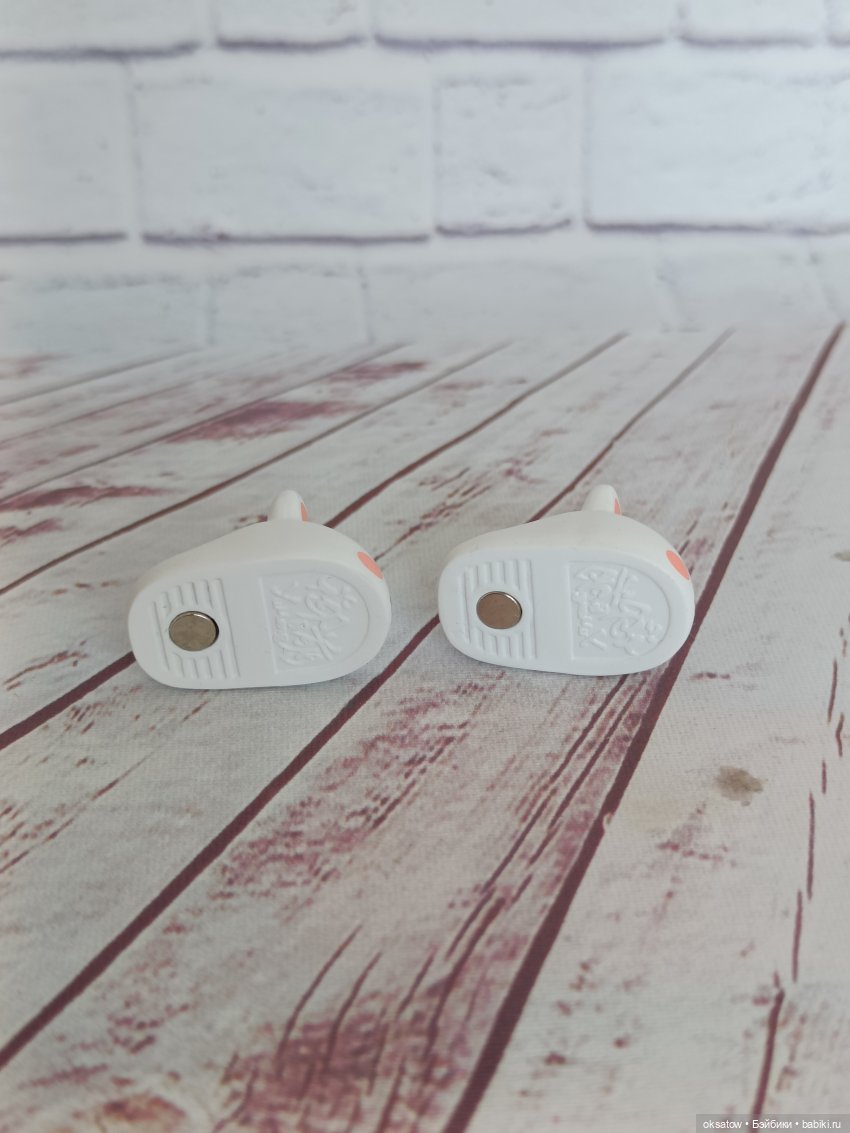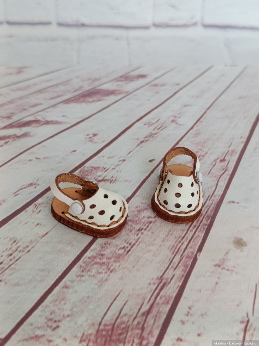 3) белые тапочки-сабо с мордочкой котенка, из пластика, на подошве впаян магнит для устойчивости куклы. Размеры по подошве 2,3 см * 1,2 см.