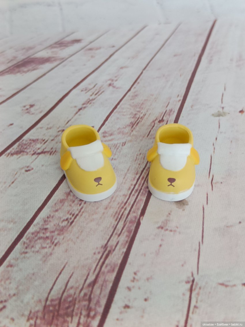4) желтые туфельки с мордочкой щенка, из пластика, на подошве впаян магнит для устойчивости куклы. Размеры по подошве 2,3 см * 1,2 см.