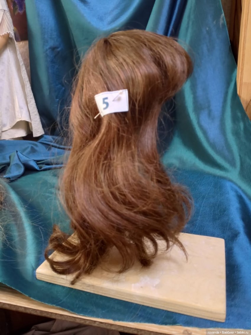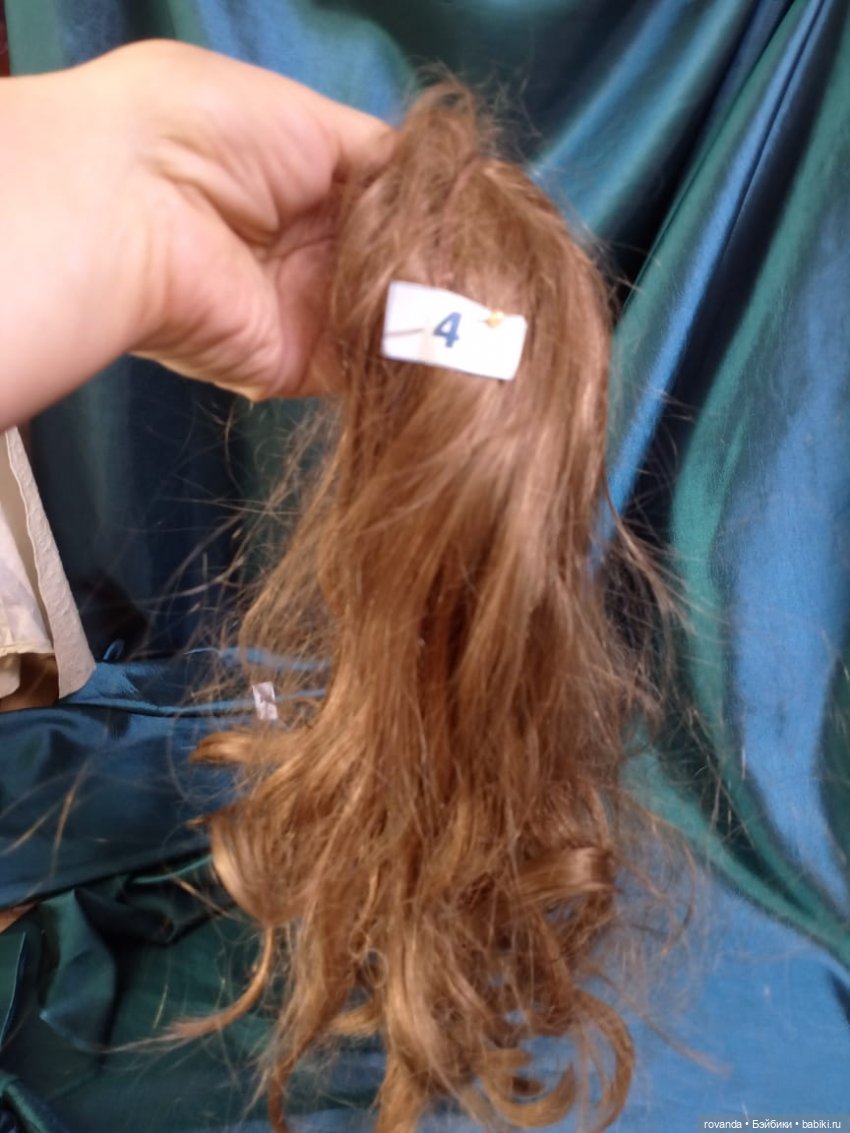 Парик третий. Цвет медный, на обхват головы 25-30см. Волос жесковат. Длина волос 30см. Видимо был снят с куклы, есть следы клея. Цена 800 руб.
