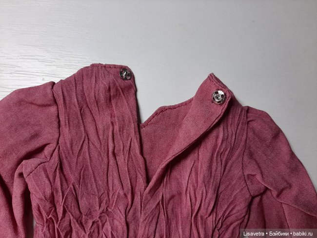 Застёгивается на спинке на две прозрачные пластиковые кнопки.