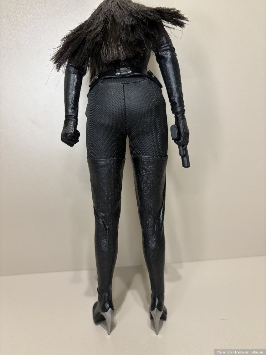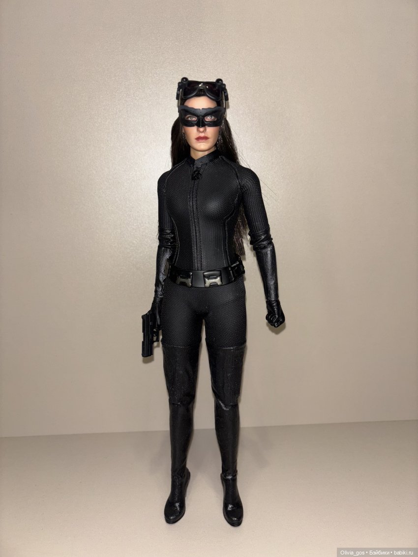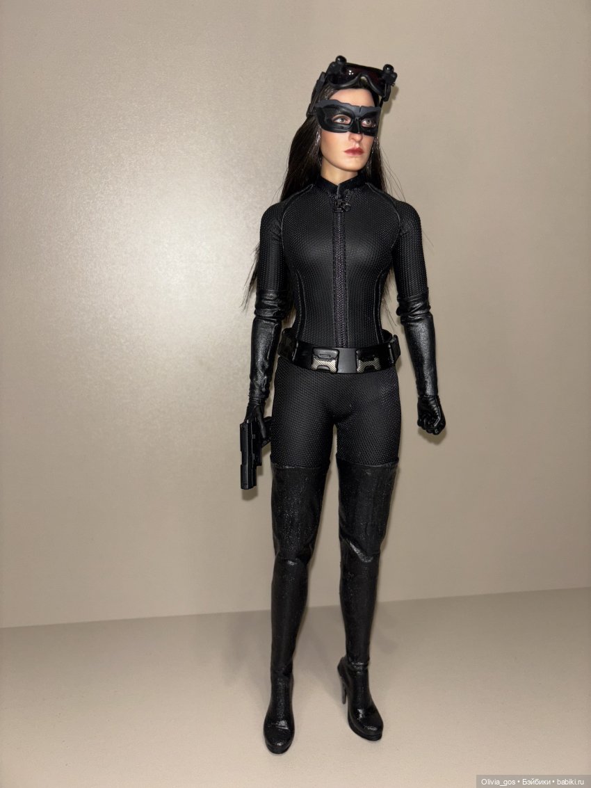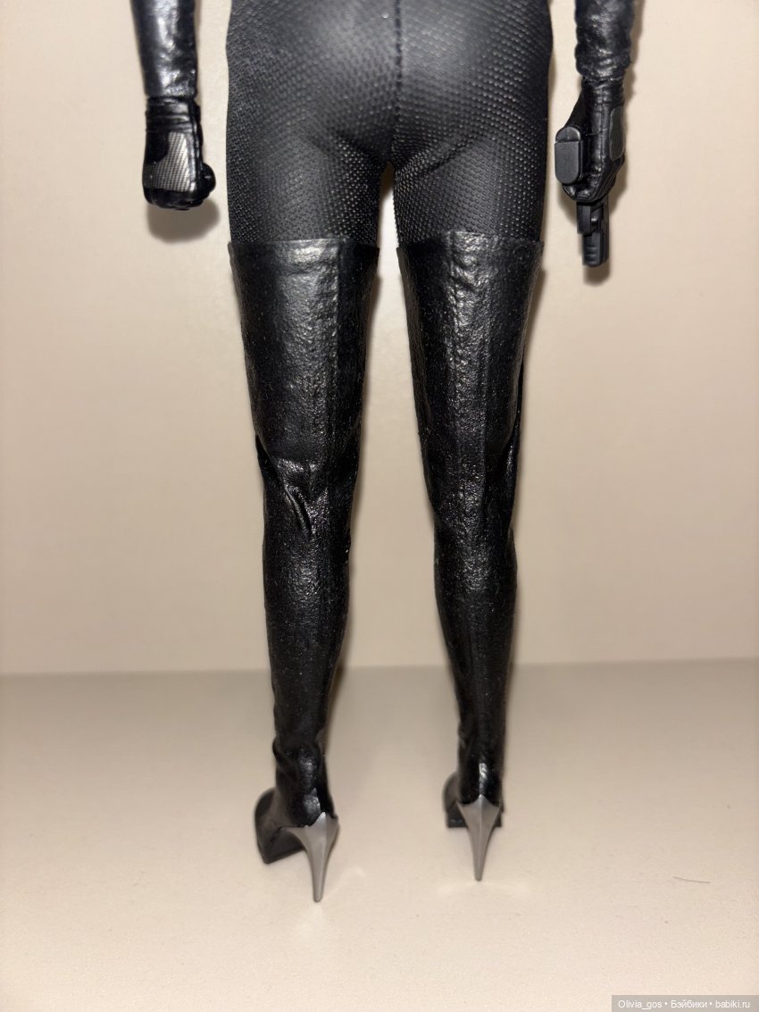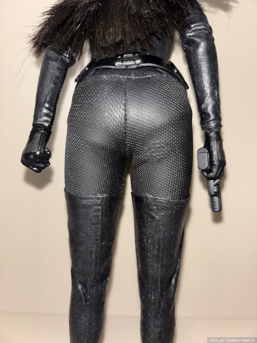 Женщина кошка с неродной, но прекрасной головой. Тело, подставка, очки, пистолет, сменные кисти, коробка — родные. Голова с али, с ней шли очки красного цвета, всё это будет в комплекте. Кто знаком с выпуском женщины кошки Hot toys в 2013 году, наверняка слышали, что кожаные части аутфита- сапоги и верх перчаток- сыпались, сходил верхний слой «кожи». Мою девочку это также не миновало и я покрыла эти части жидкой кожей. На костюме сзади небольшая растянутость, это видно только если наклонить или посадить куклу. Прошивка неожиданно густая, голова красивая и идеально подошла к телу. Много доп фото