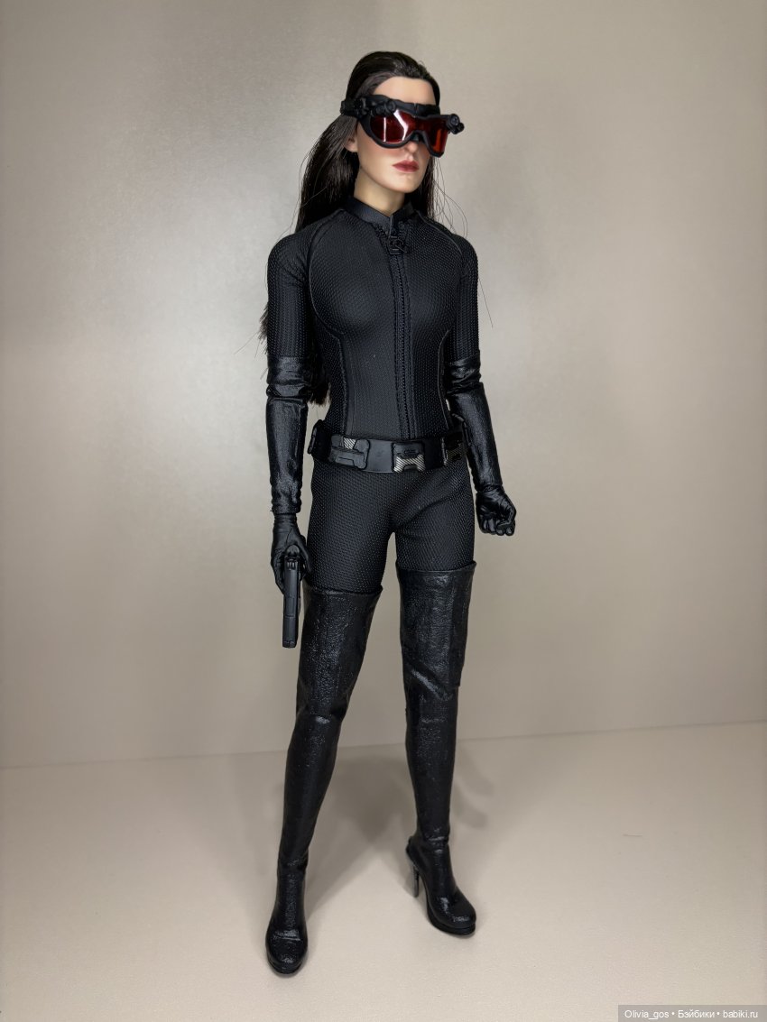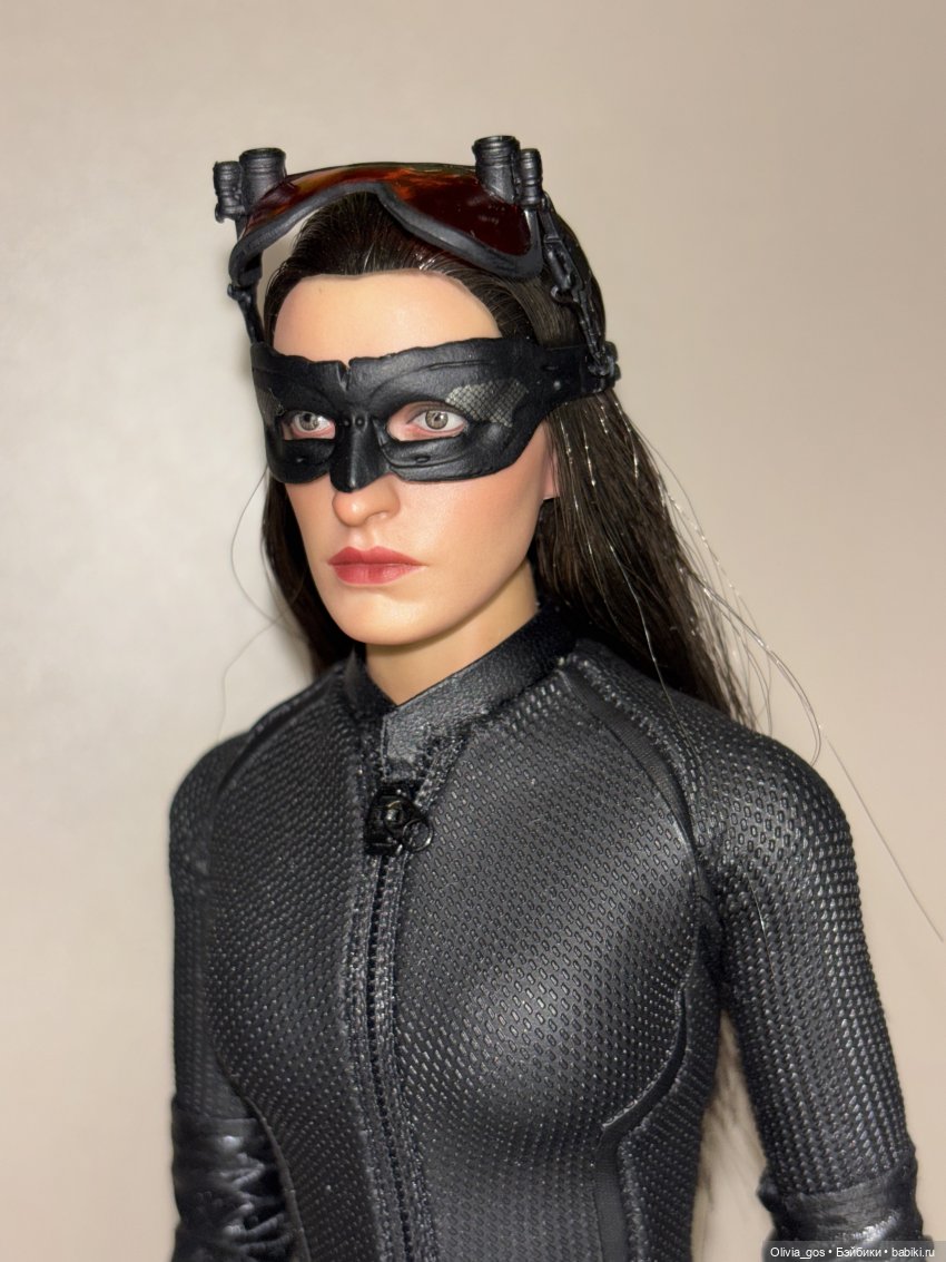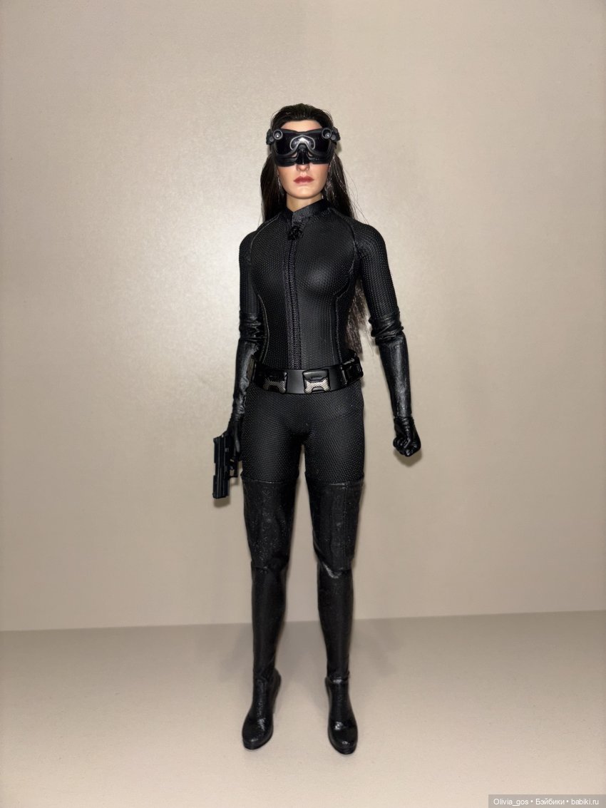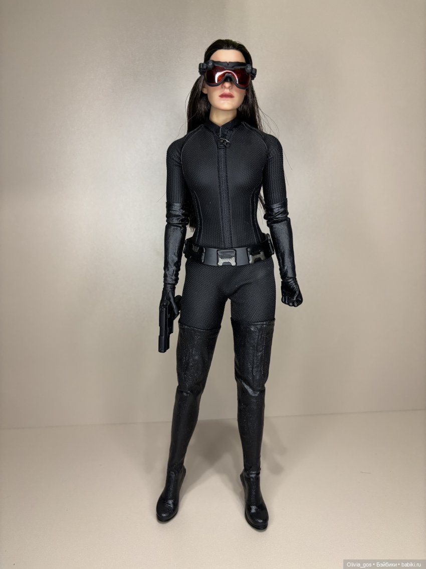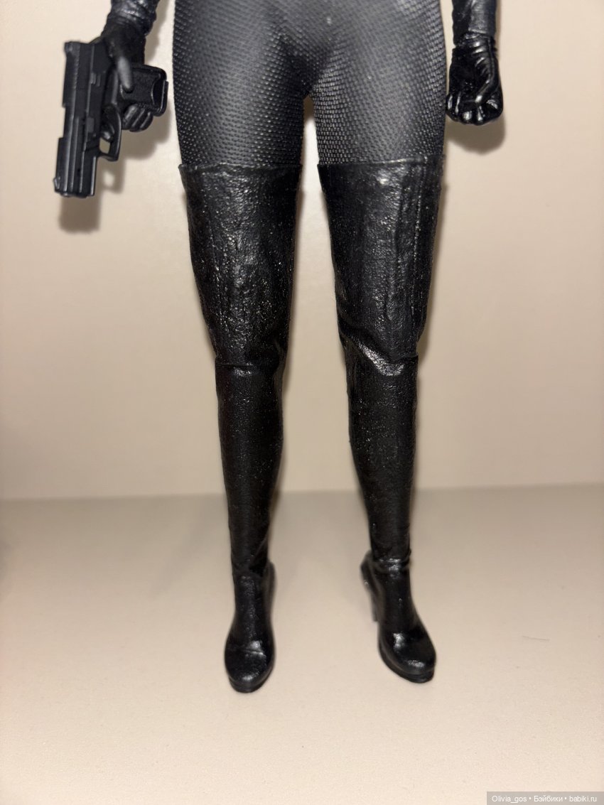 Женщина кошка с неродной, но прекрасной головой. Тело, подставка, очки, пистолет, сменные кисти, коробка — родные. Голова с али, с ней шли очки красного цвета, всё это будет в комплекте. Кто знаком с выпуском женщины кошки Hot toys в 2013 году, наверняка слышали, что кожаные части аутфита- сапоги и верх перчаток- сыпались, сходил верхний слой «кожи». Мою девочку это также не миновало и я покрыла эти части жидкой кожей. На костюме сзади небольшая растянутость, это видно только если наклонить или посадить куклу. Прошивка неожиданно густая, голова красивая и идеально подошла к телу. Много доп фото