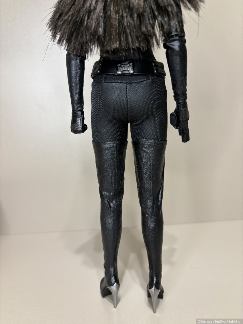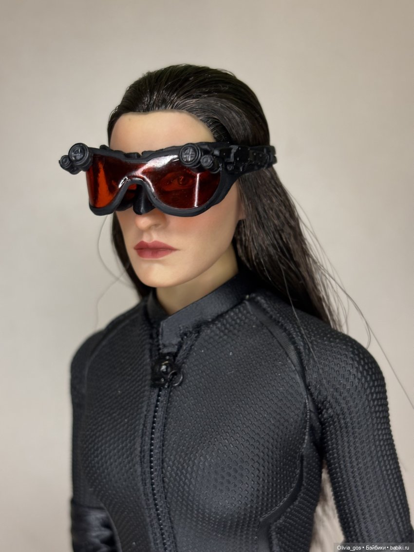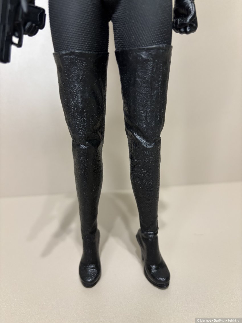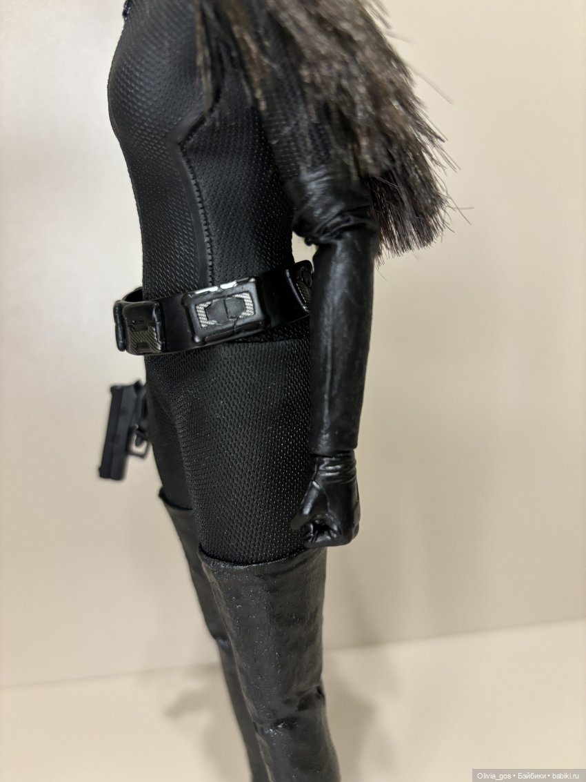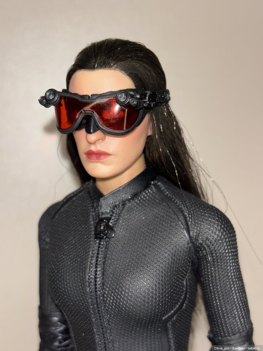 Женщина кошка с неродной, но прекрасной головой. Тело, подставка, очки, пистолет, сменные кисти, коробка — родные. Голова с али, с ней шли очки красного цвета, всё это будет в комплекте. Кто знаком с выпуском женщины кошки Hot toys в 2013 году, наверняка слышали, что кожаные части аутфита- сапоги и верх перчаток- сыпались, сходил верхний слой «кожи». Мою девочку это также не миновало и я покрыла эти части жидкой кожей. На костюме сзади небольшая растянутость, это видно только если наклонить или посадить куклу. Прошивка неожиданно густая, голова красивая и идеально подошла к телу. Много доп фото