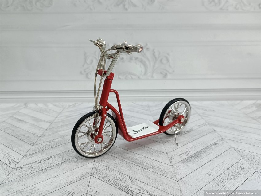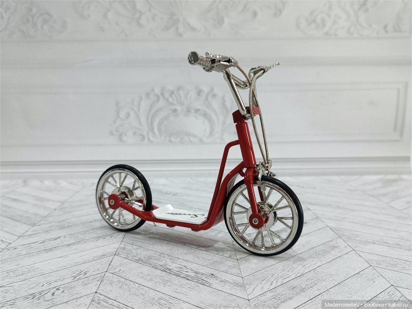 Колеса крутятся, руль поворачивается вместе с передним колесом. Интересно то, что тормоза на руле рабочие, если на него нажать (как на фото) — переднее колесо тормозится. Стоит, опираясь на подножку на заднем колесе.