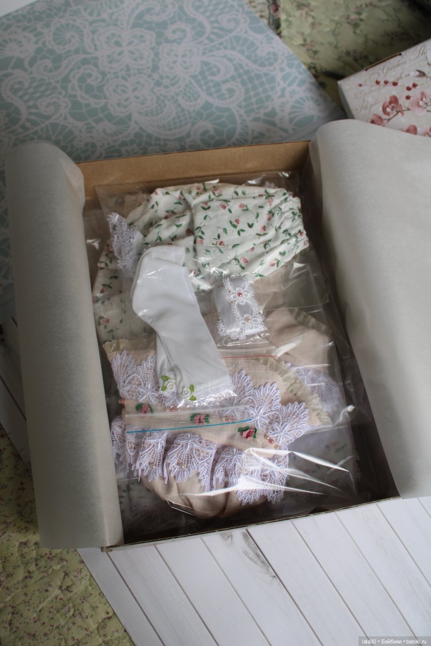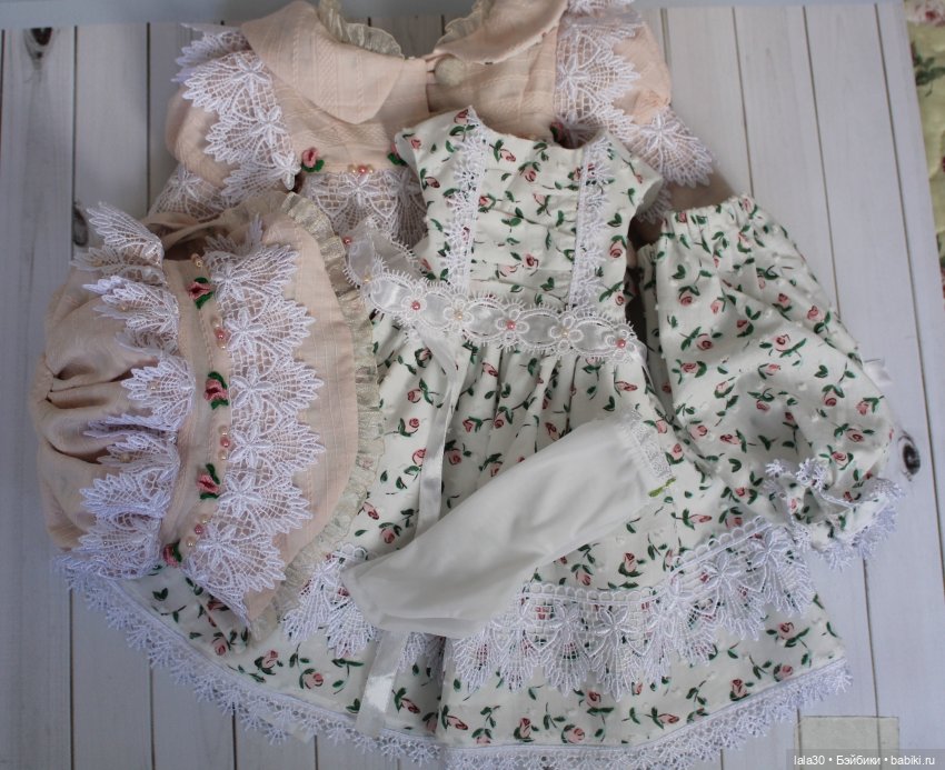 Комплект для малышек Gotz, рост 50 см. Сшит из фактурного хлопка, фактурного батиста, подкладка из батиста, все швы спрятаны. Украшено кружевом, вышивкой, бусинами.