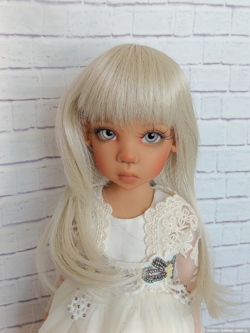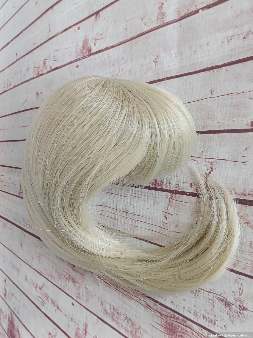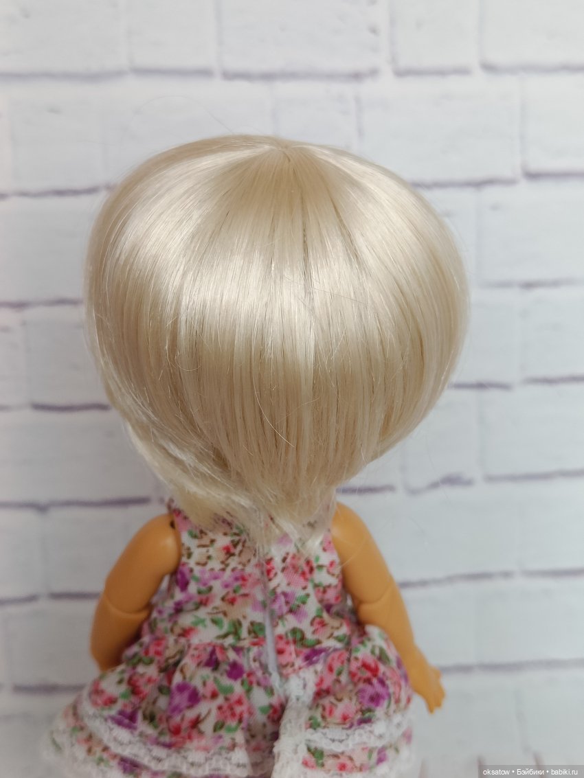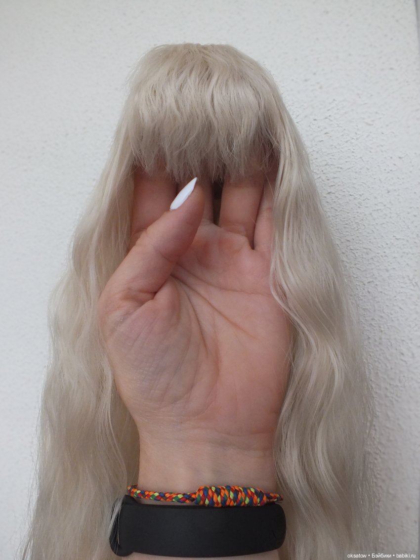 7) парик размера 7-8, фирма Dollmore, парик средней длины с челкой, цвет холодный блонд. Новый, на куклу примеряла только для фото ниже. Материал волоса упругий канеколон, шапочка мало тянется. На голову обхватом 21-22 см. (обхват по наружному краю шапочки 20,5см)