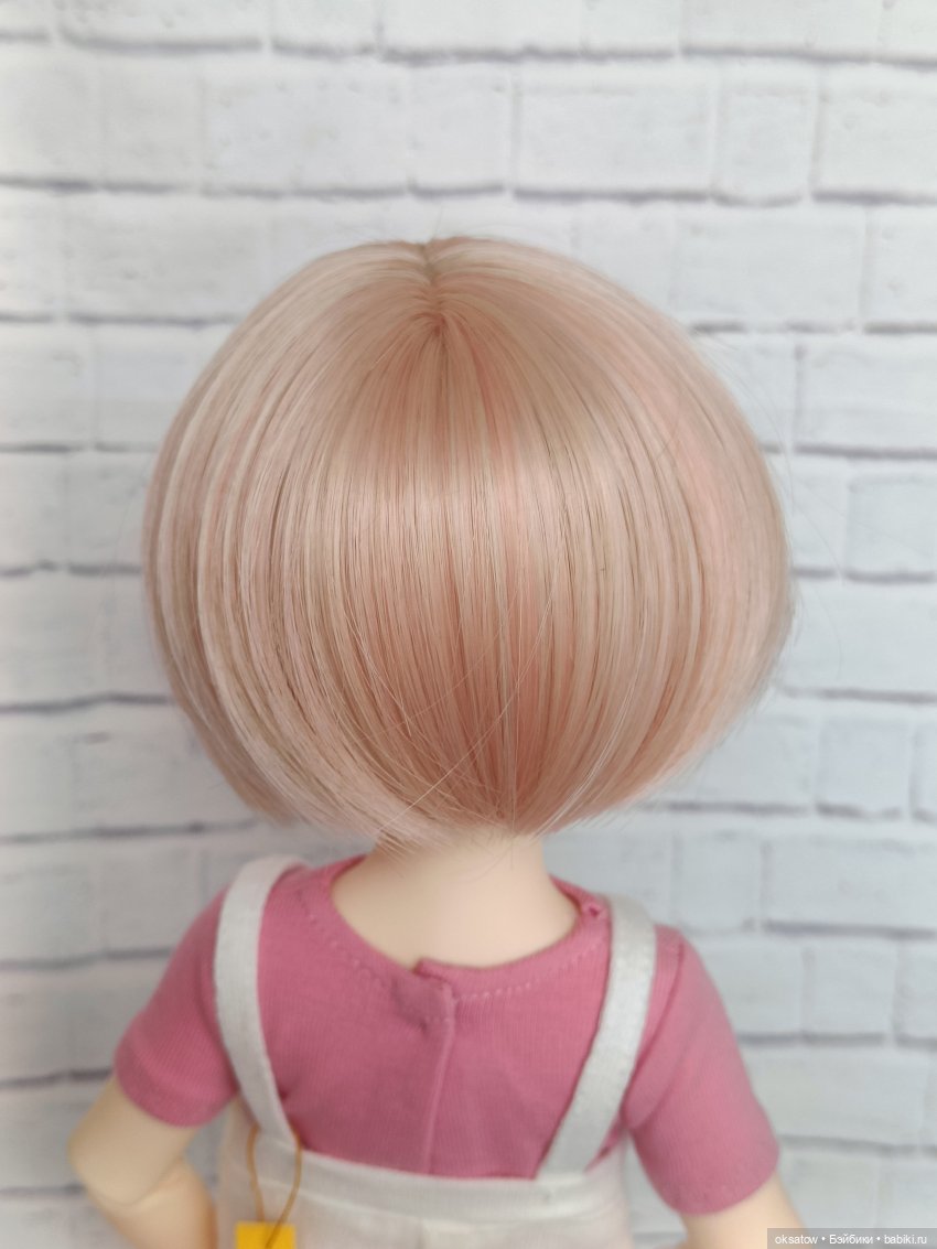 6) ПРОДАНО! парик размера 6-7, фирма ForMyDoll, короткий с челкой, стрижка каре, цвет сложный — смесь нежно-розового и светлого блонда. Одевала три раза на куклу. Материал волоса упругий канеколон, шапочка мало тянется. В фирменной упаковке.