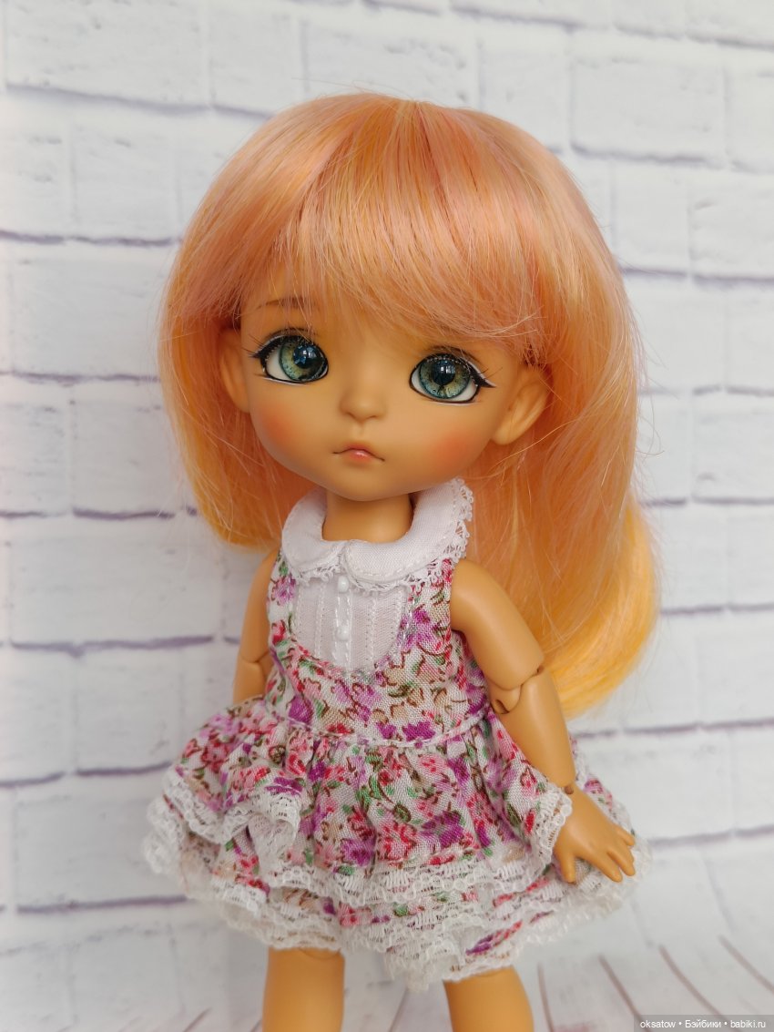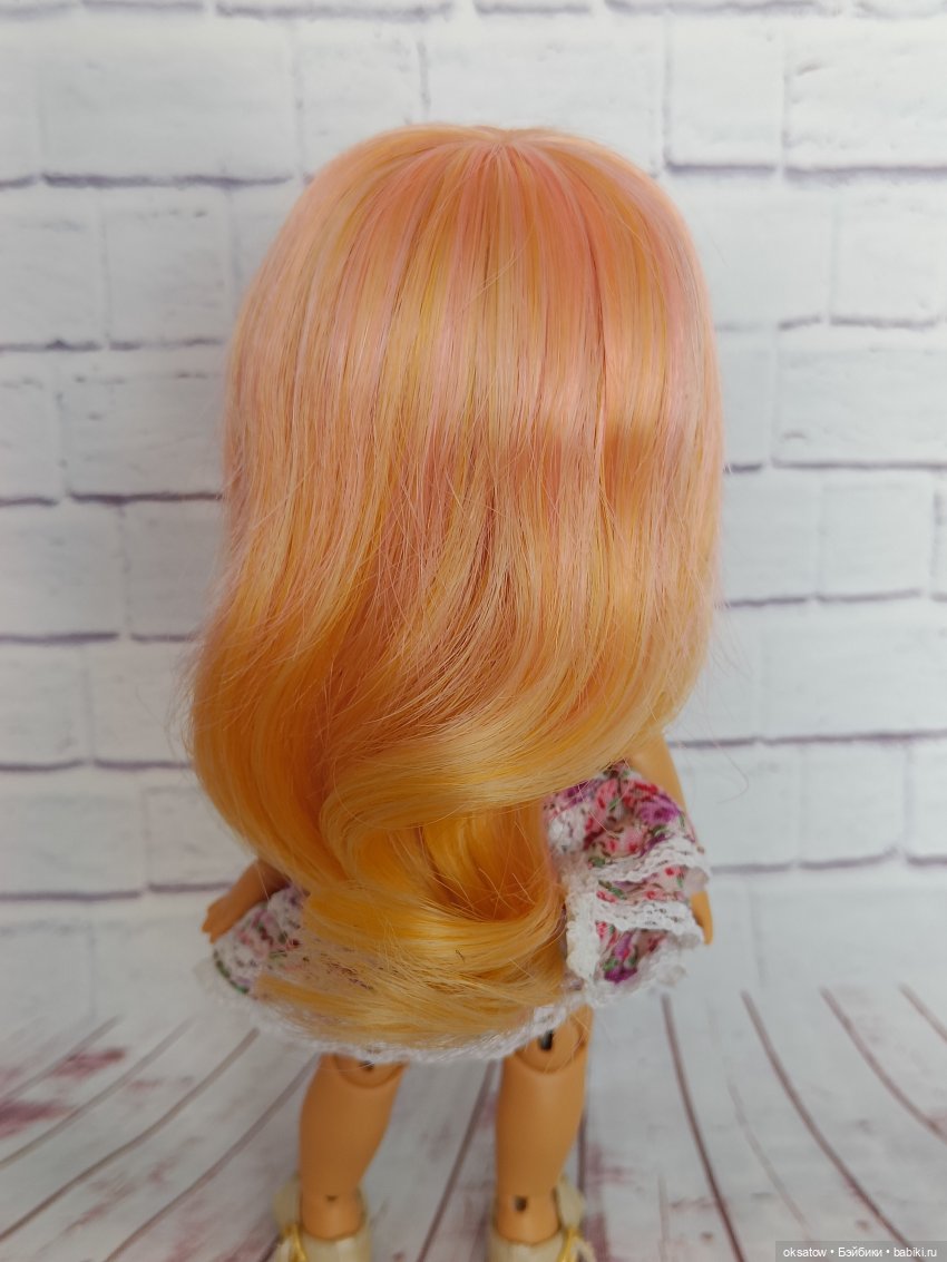 5) ПРОДАН! парик размера 5-6, фирма Latidoll, очень красивый, средней длины с челкой, конец волос завит в один крупный завиток, цвет сложеный — смесь нежно-розового, персикового и золотого блонда. Новый, на куклу примеряла только для фото ниже. Материал волоса канеколон, шапочка мало тянется. В фирменной упаковке Latidoll.