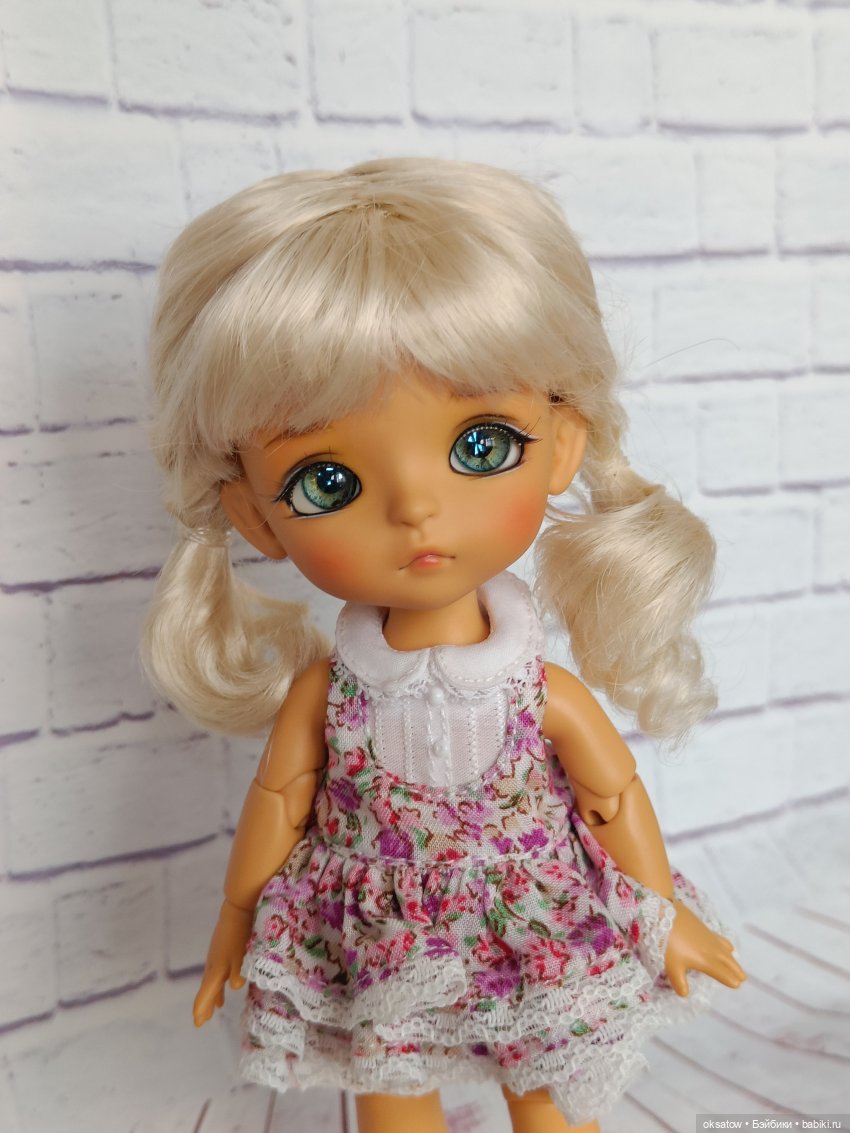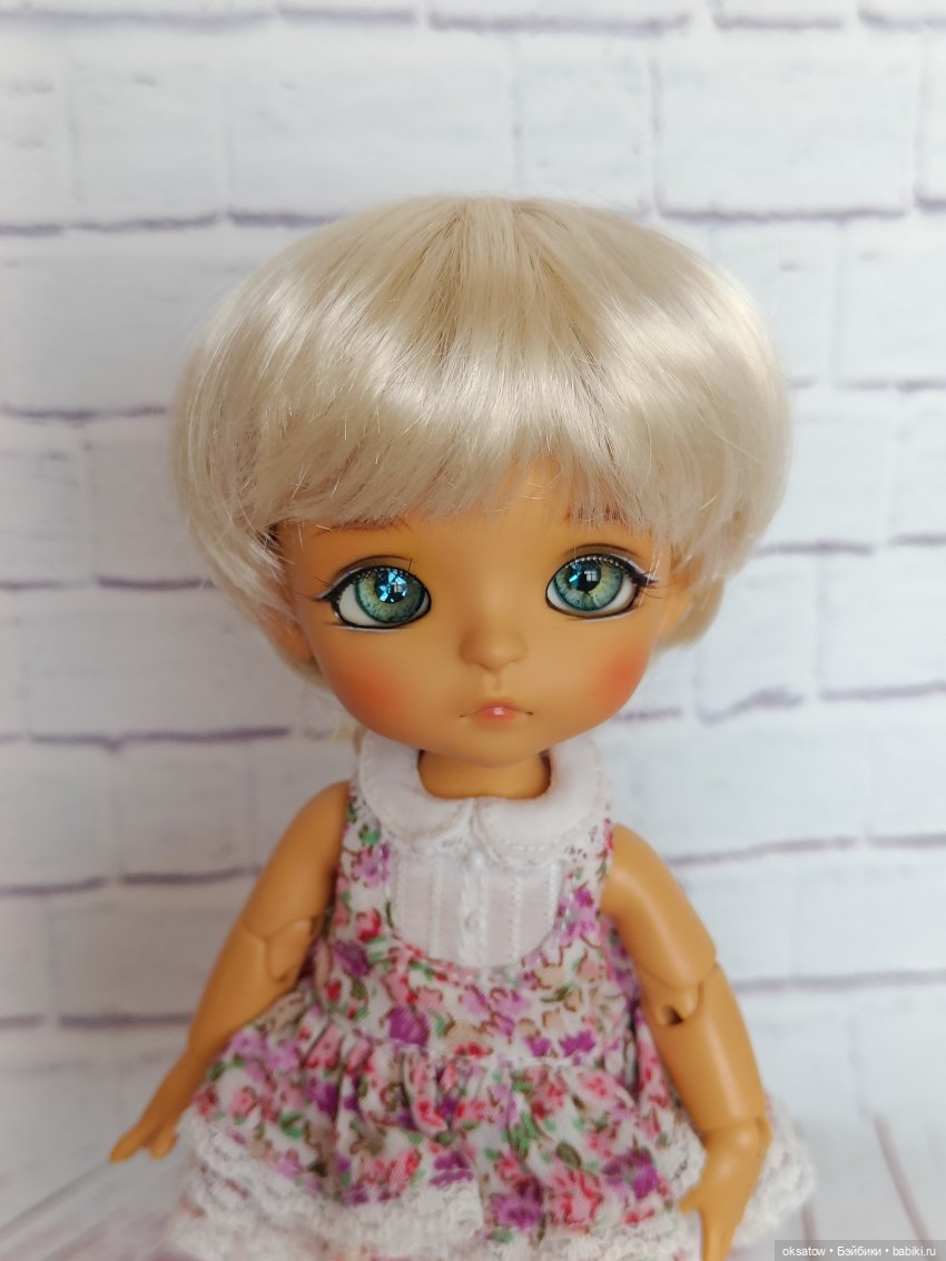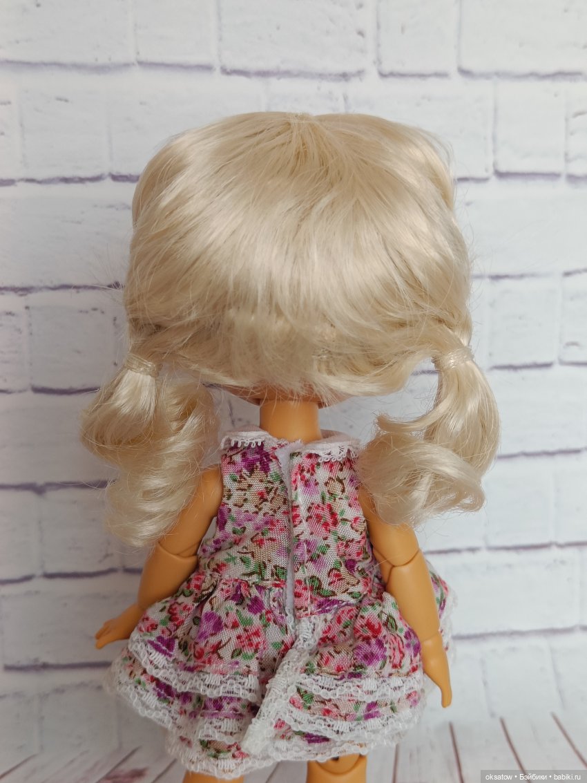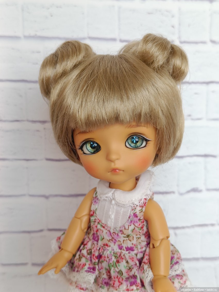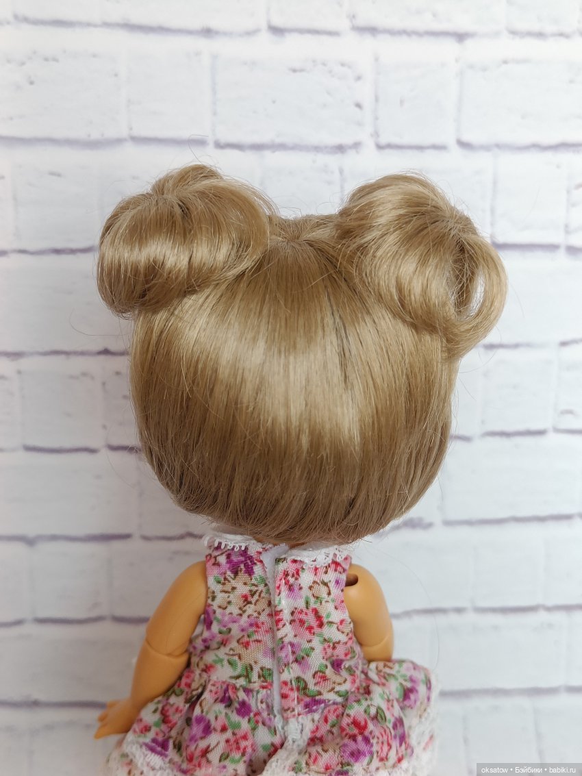 3) парик размера 5-6, фирма Fatiao, короткий с челкой, прямой пробор, по бокам две французские косички, переходящие в хвостики-локоны, цвет блонд. Новый, на куклу примеряла только для фото ниже. Материал волоса синт. мохер, волос мягкий, шапочка хорошо тянется. В фирменной упаковке.