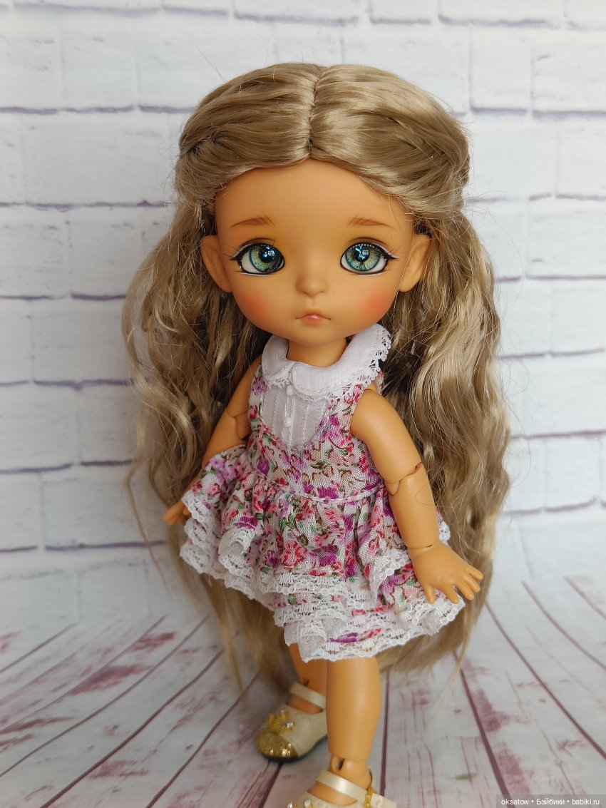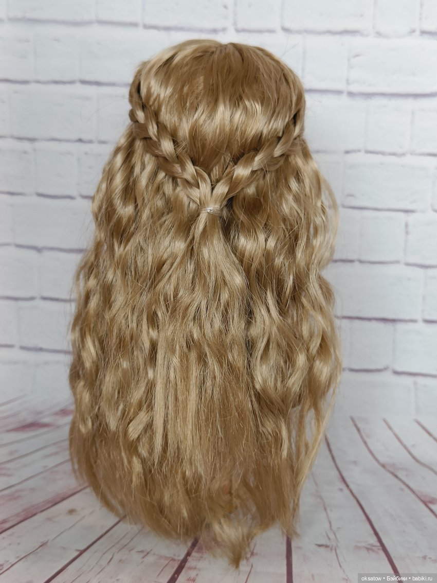 4) парик размера 5-6, фирма Fatiao, длинный без челки, вся масса волос с мелкой волной, по бокам две пряди заплетены в косички и закрепелны сзади, цвет русый. Новый, на куклу примеряла только для фото ниже. Материал волоса синт. мохер, волос мягкий, шапочка хорошо тянется. В фирменной упаковке.
