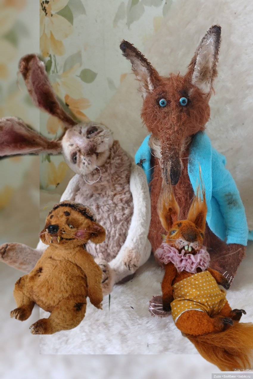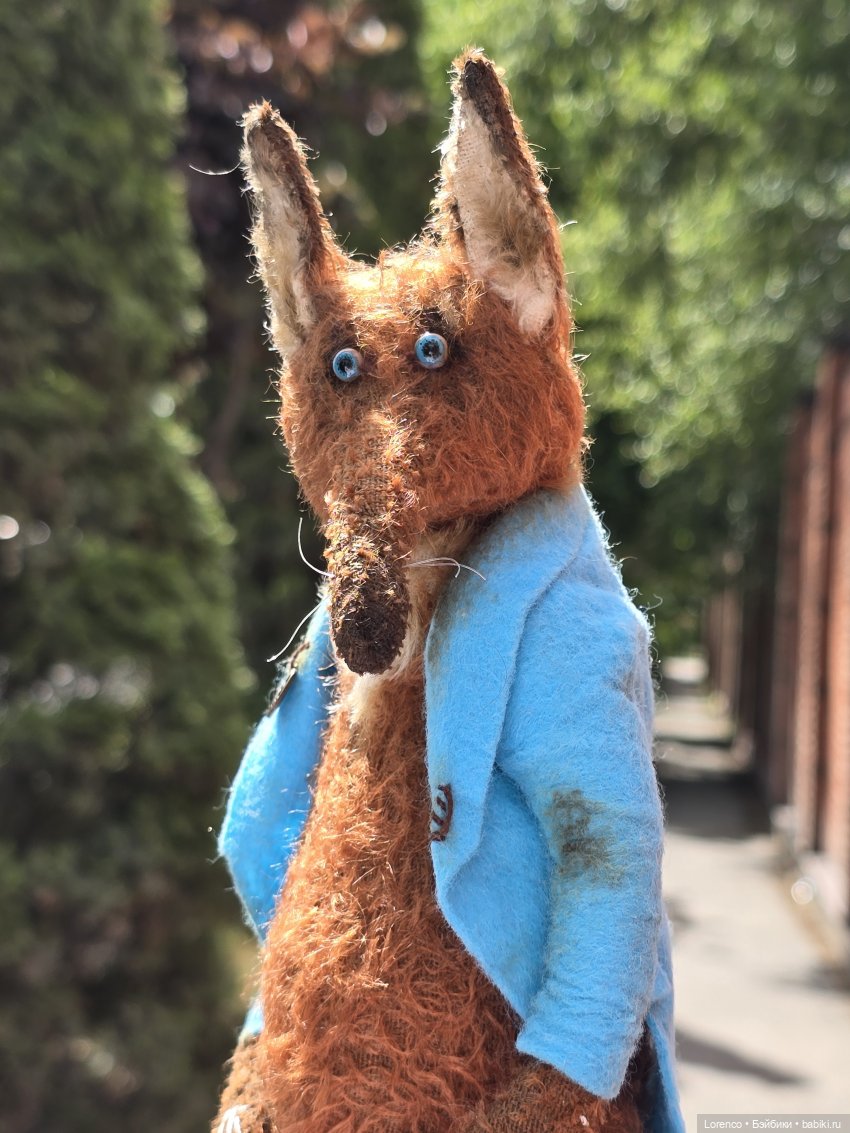 Лис сшит из мохера. Набит опилками. Соединение шплинтовое. Глазки стеклянные. Тонировка маслом.