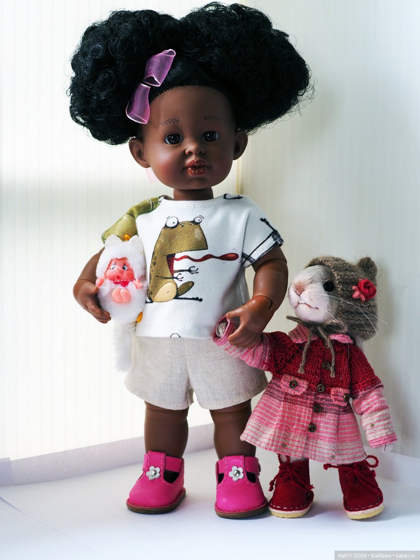 Мастер ошарнирила для меня двух негритяночек.Ушки у фабричных шоколадок «волосатые», мастер зашлифовала ушки, убрав виниловые ниточки, теперь они гладенькие, красивые. Я заказала роспись девочки с кривой прошивкой, она на последней фотографии! Девочка, предлагаемая к продаже, изначально была лучше по прошивке и фабричному мейку. Есть НЕДОСТАТОК: на конце пробора 3 дырочки без волос, на фотографии видно. В глаза не очень бросается.