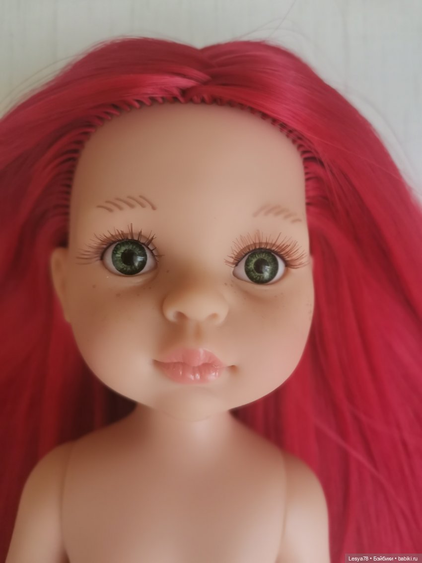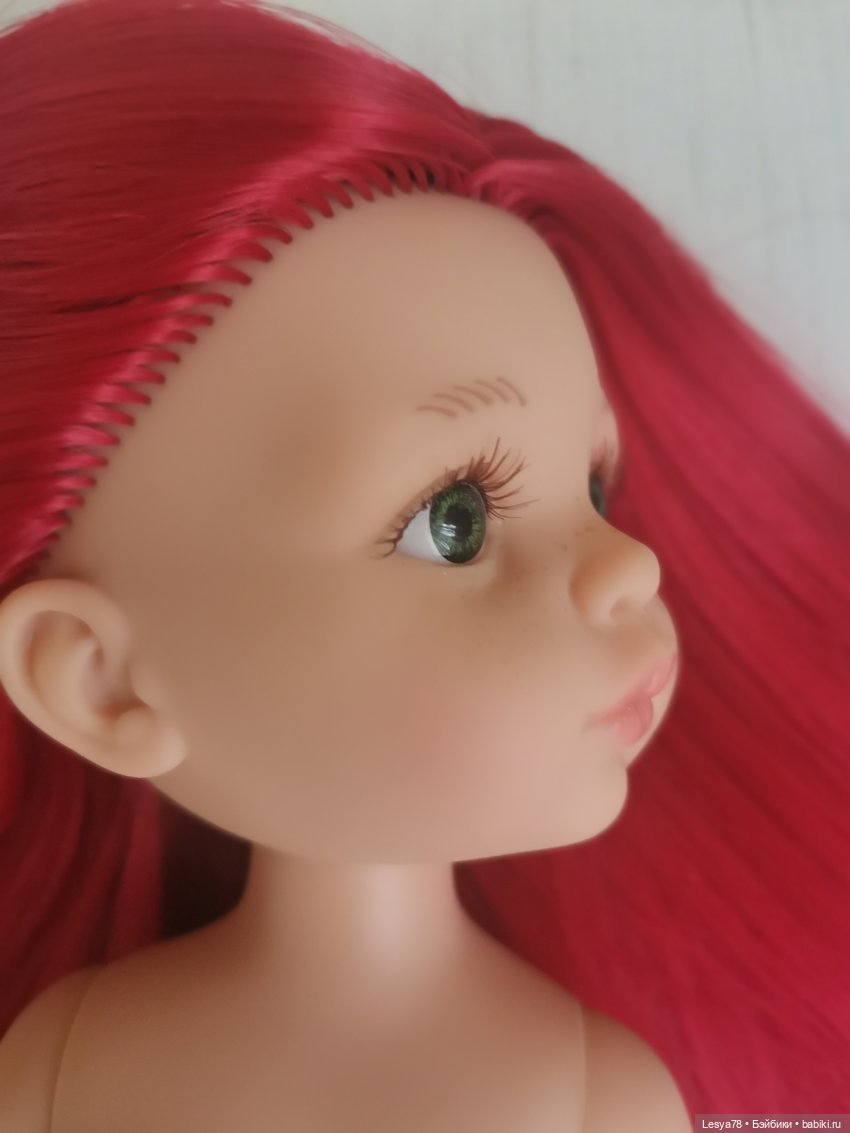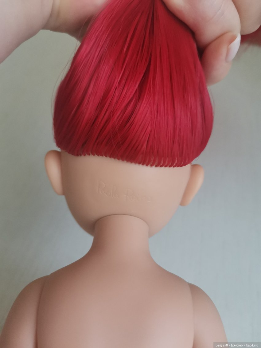 Куколка прошита искусственными трессами красного цвета. Трессы приятные наощупь, шелковистые. Длина — ниже трусиков. Волосы можно расчесывать. При укладке можно использовать фен или плойку на невысокой температуре.