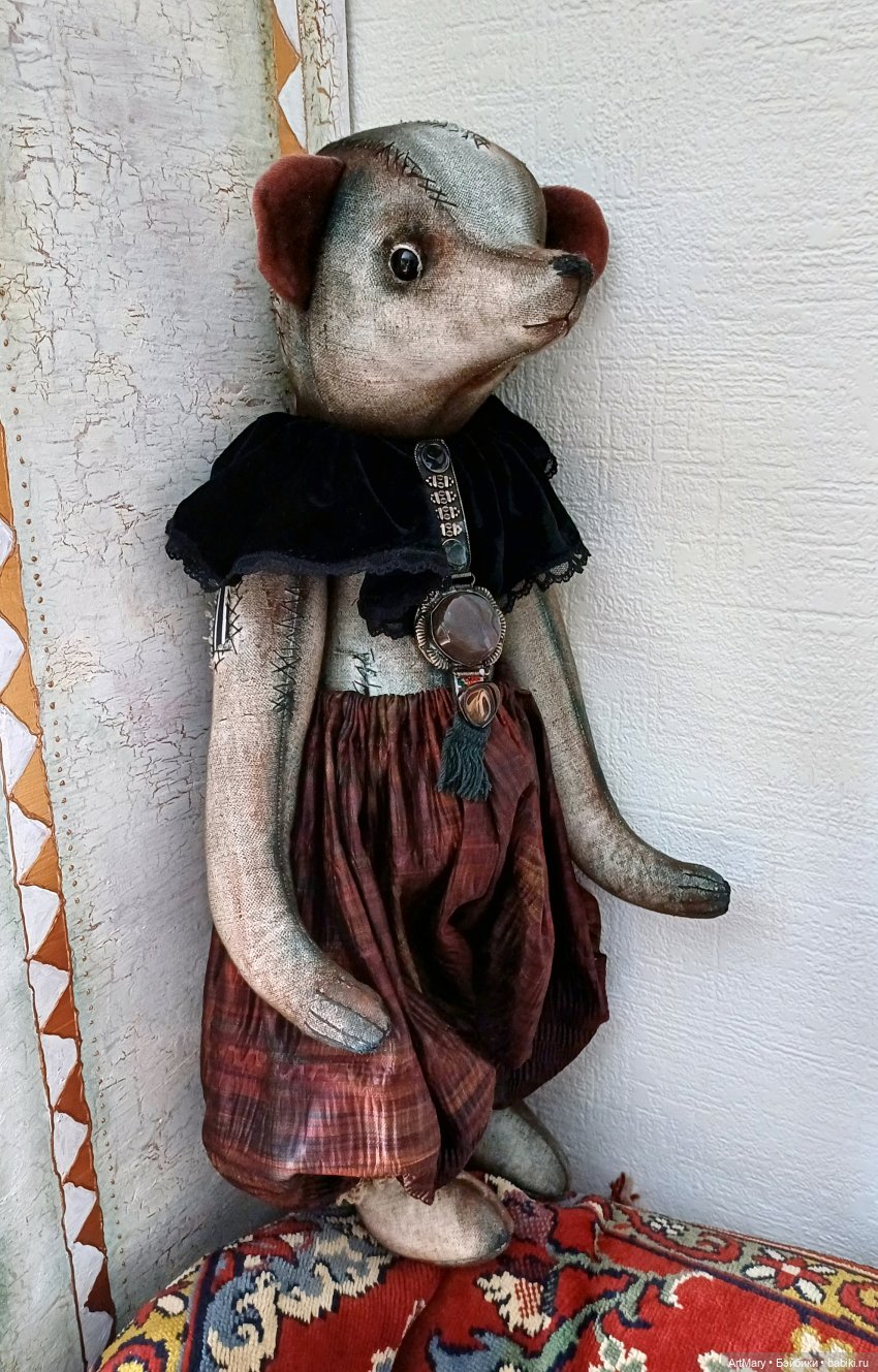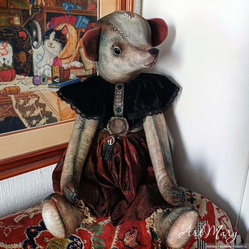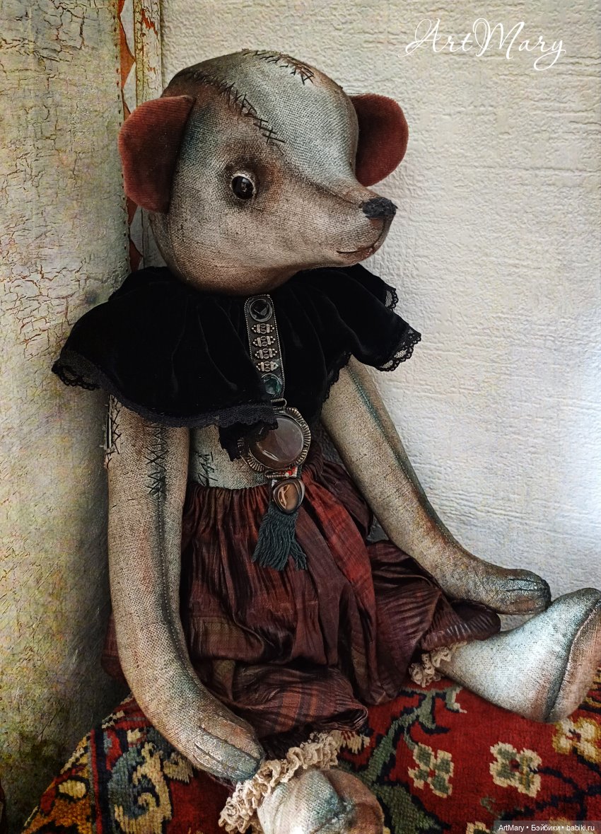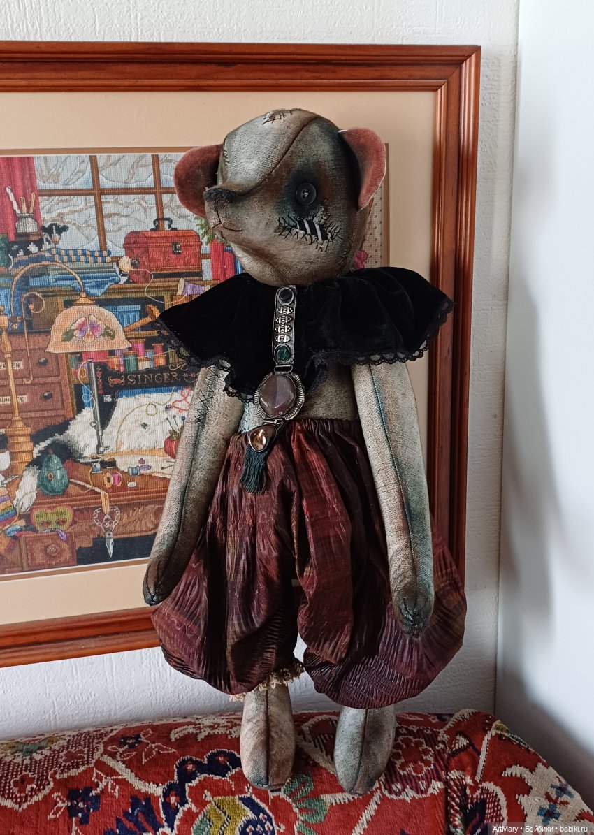 Один глаз стеклянный, другой «утерян»-вместо него пришита пуговица. Пятиболтовое крепление: все части тела подвижные. Плотная набивка синтепоном и минеральным гранулятом. Панталоны из японского антикварного шелка. Воротник из антикварного шелкового панбархата. Вышитая крестиком лямка.