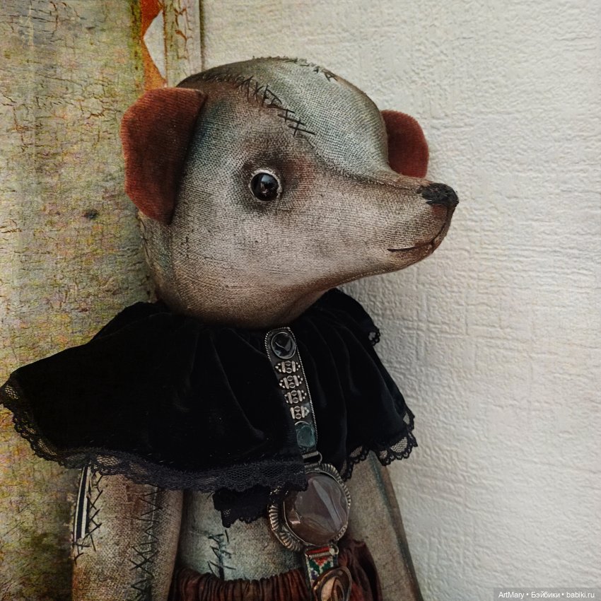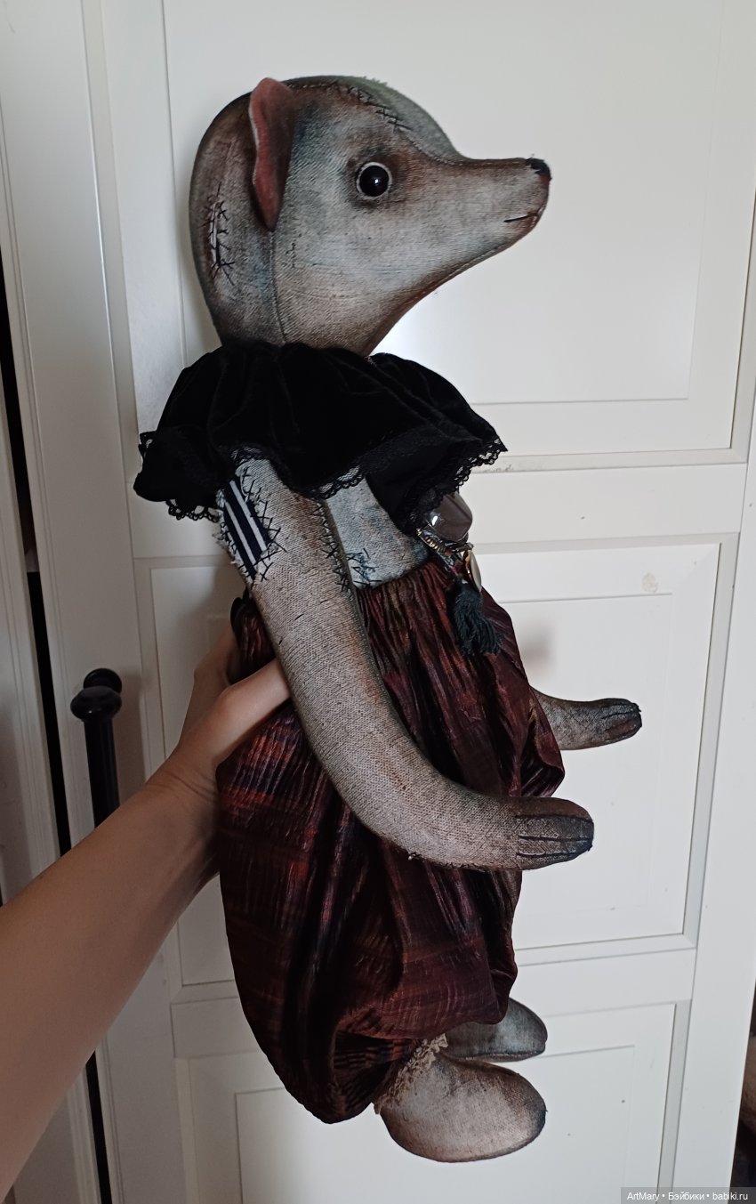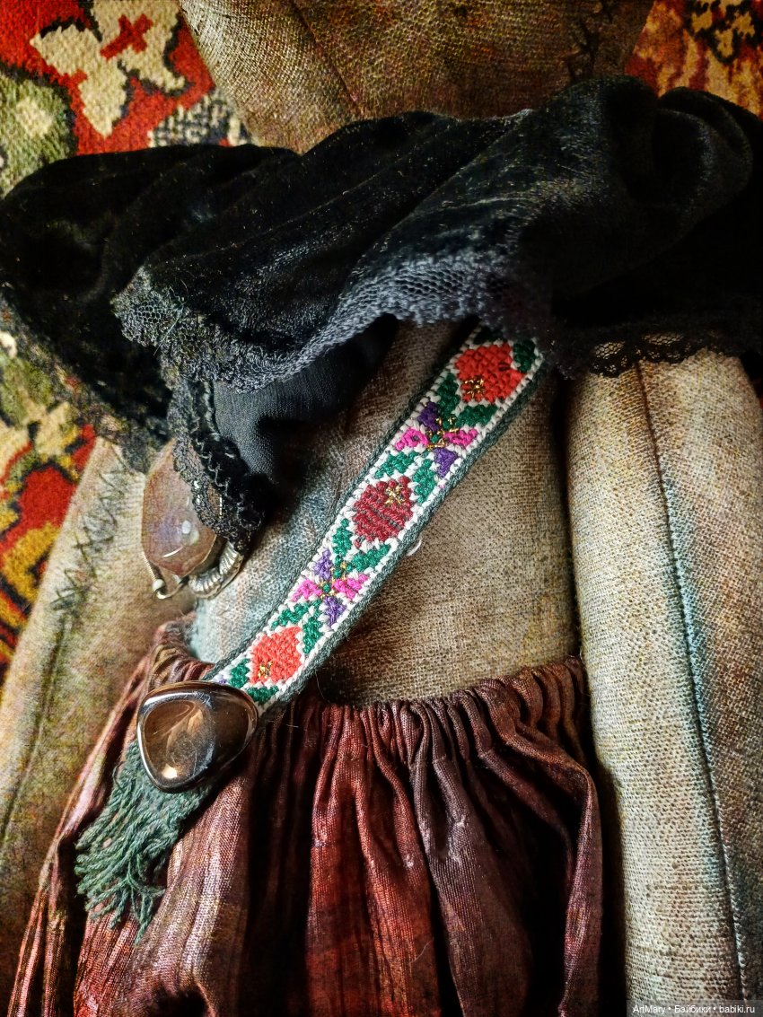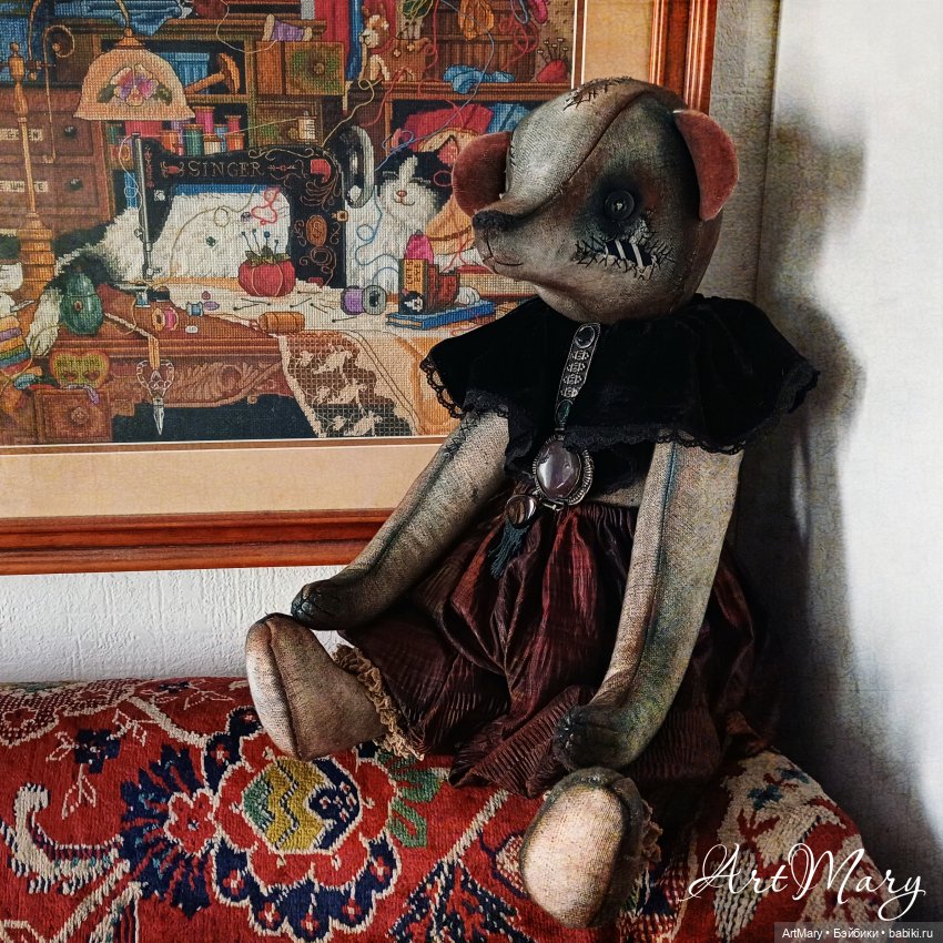 Один глаз стеклянный, другой «утерян»-вместо него пришита пуговица. Пятиболтовое крепление: все части тела подвижные. Плотная набивка синтепоном и минеральным гранулятом. Панталоны из японского антикварного шелка. Воротник из антикварного шелкового панбархата. Вышитая крестиком лямка.