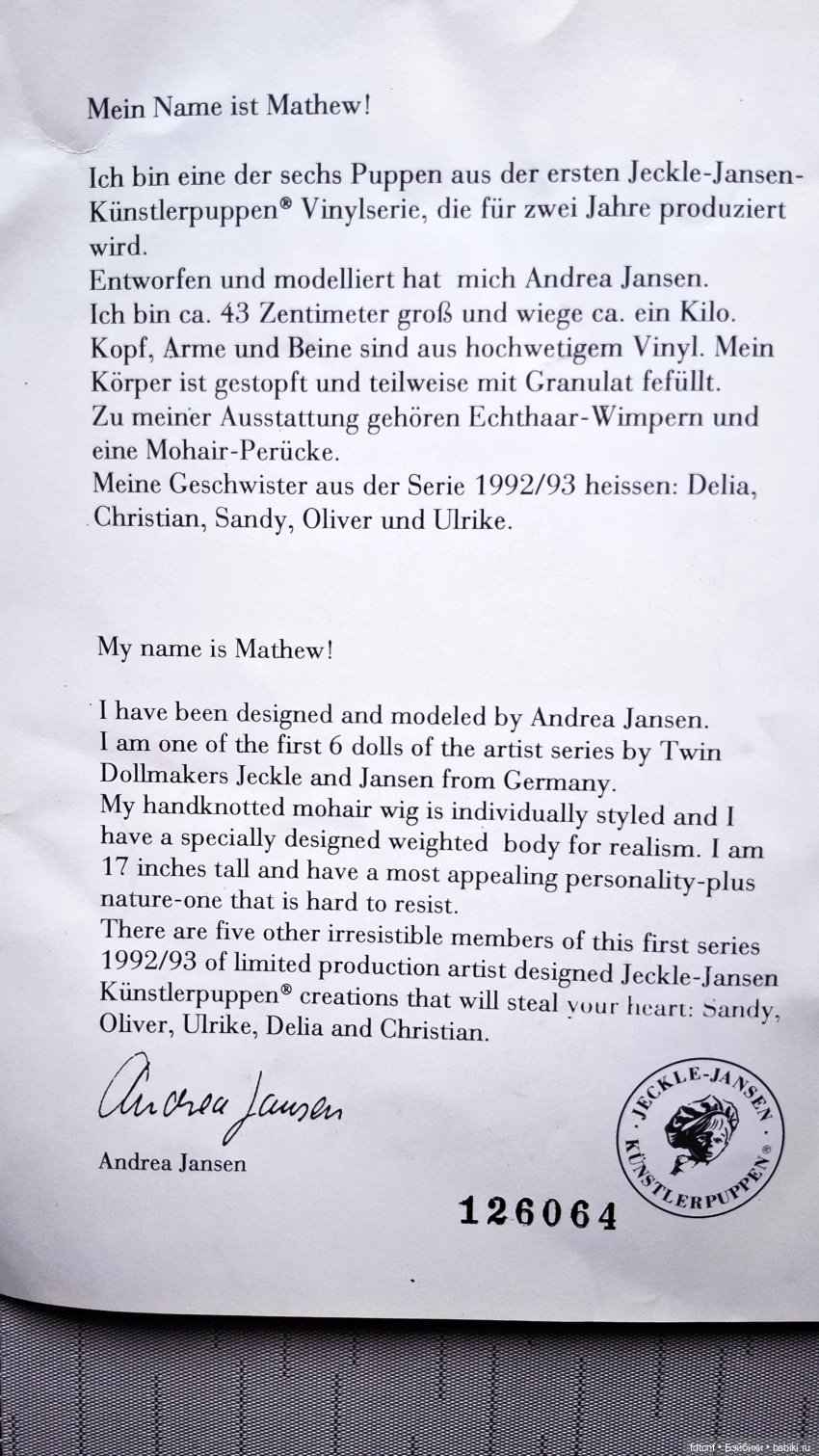 Имя малыша Мэттью. Один из шести малышей, выпущенных в первой серии кукол Jeckle — Jansen Kunstlerpuppen, созданной известными немецкими художницами Андреа Джансен и Петра Джекли.