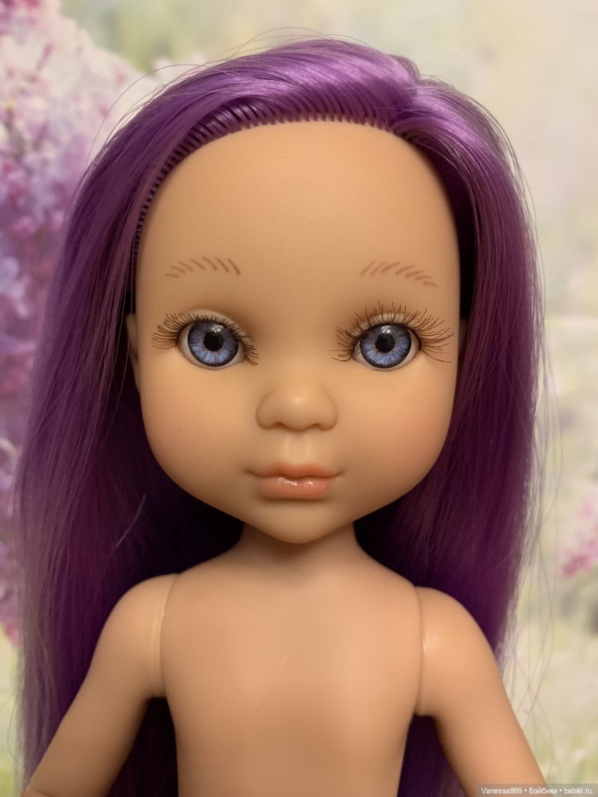 Доставала из пакетика для объявления… Рост 35 см.Полностью виниловая… Волосы фиолетового цвета, длинные прошиты по всей голове, прошивка круговая не так как у Паолок, но хорошая. Глазки синие с ресничками не закрываются. Ароматизирована запахом ванили как и куколки от Паола Рейна.