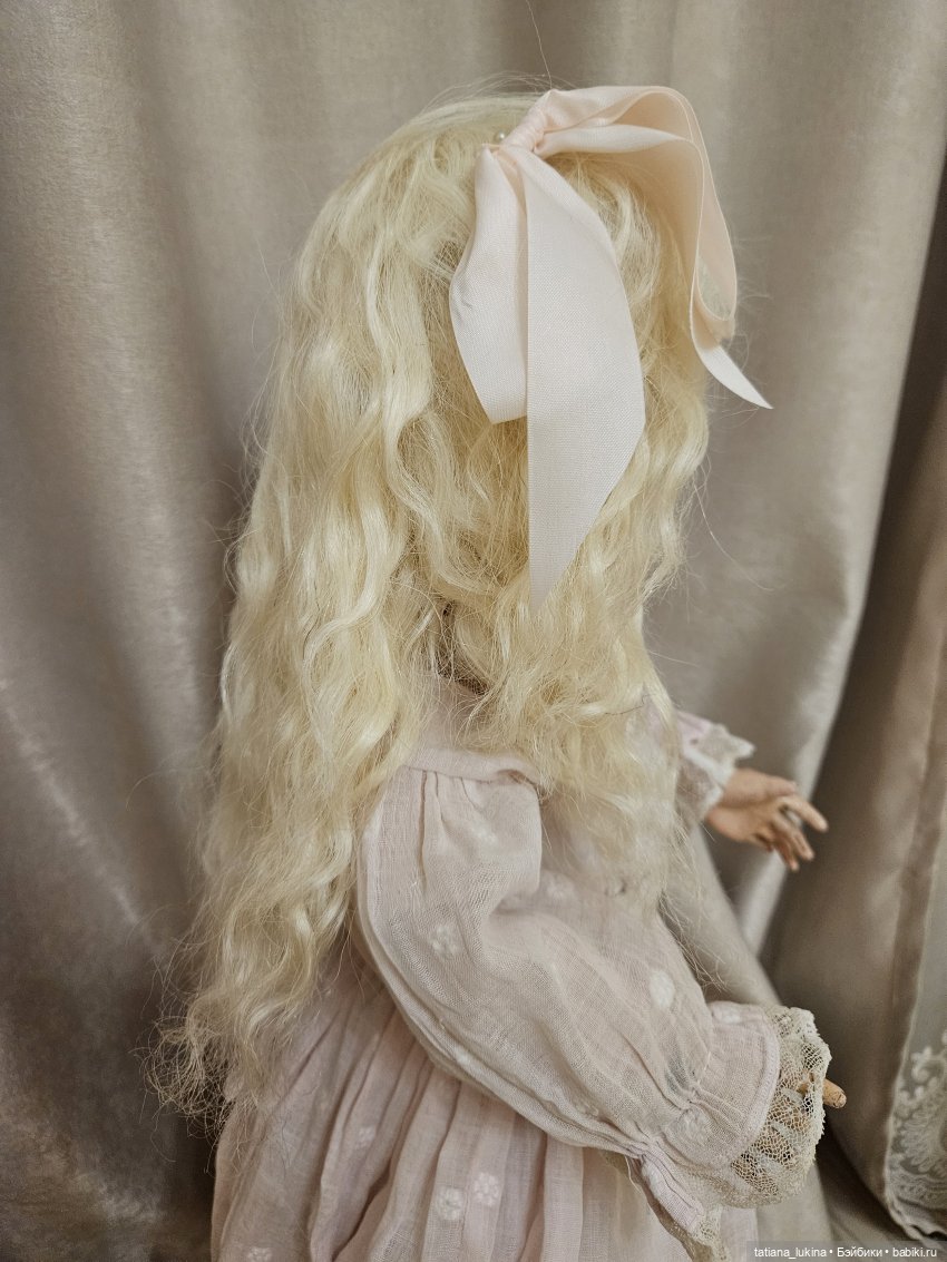 Парик из верблюжеьей шерсти, довольно мягкий, но жестче если сравнить с мохером. Сшит вручную, с небольшим удлиннением. Расчесывать не рекомендую, так как лезут волоски. Можно накручивать на бигуди и немного выпрямить при желании утюжком.