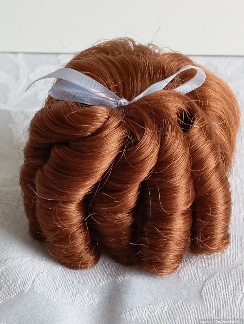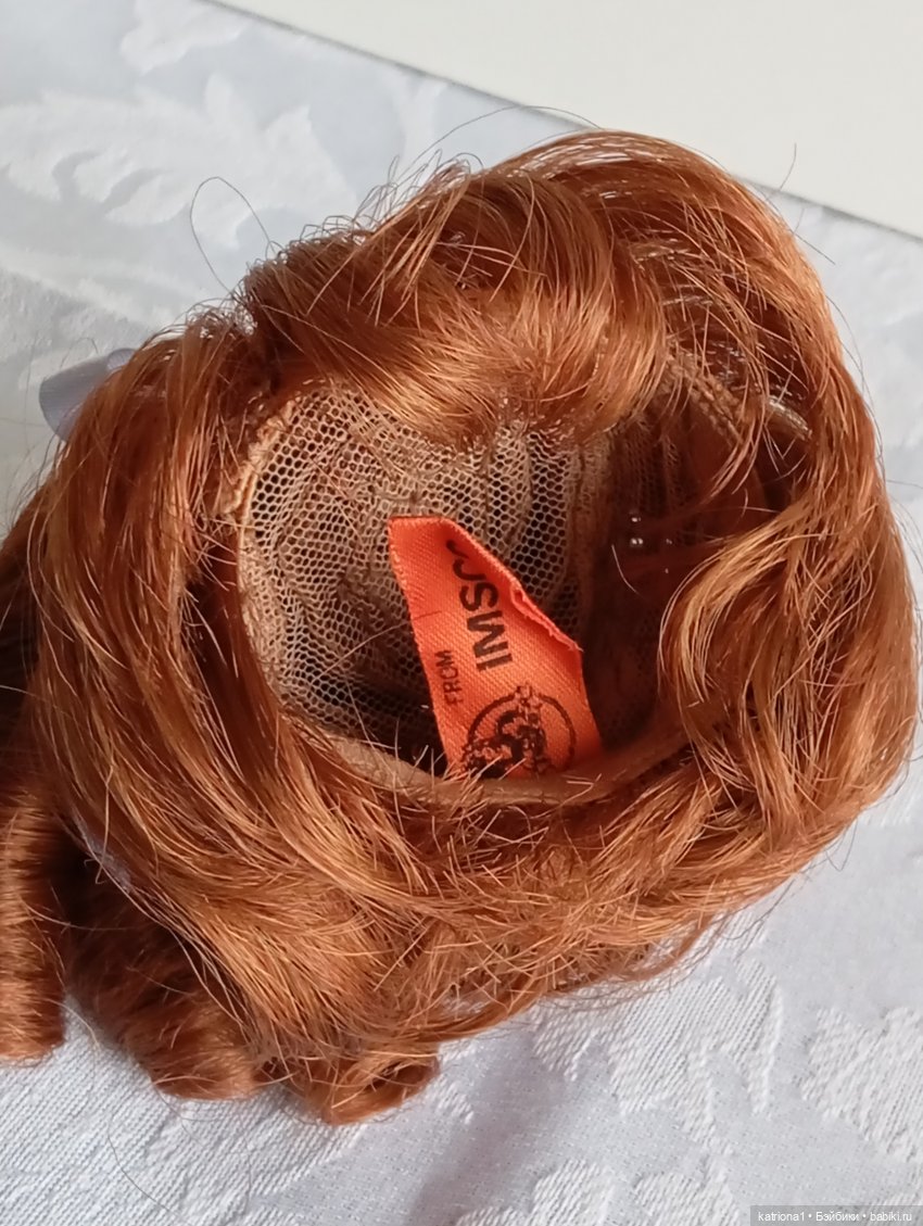 Парик абсолютно новый. Покупался в Америке. Красивая уложенная прическа на синтетической сетчатой шапочке. Шапочка неглубокая. Не сильно тянется. Цвет коричнево-рыжеватый. Но не медный (мне кажется, медный более красноватый) и не рыжий (на бирке strawberry). Размер указан 7-8. Но по факту не больше 6-7. Подходит для кукол с размером головы 17 см плюс-минус 0,5 см. На головку, представленной куколки парик сел хорошо. Но я покупала для Эффнер Little Darling. Им маловат.