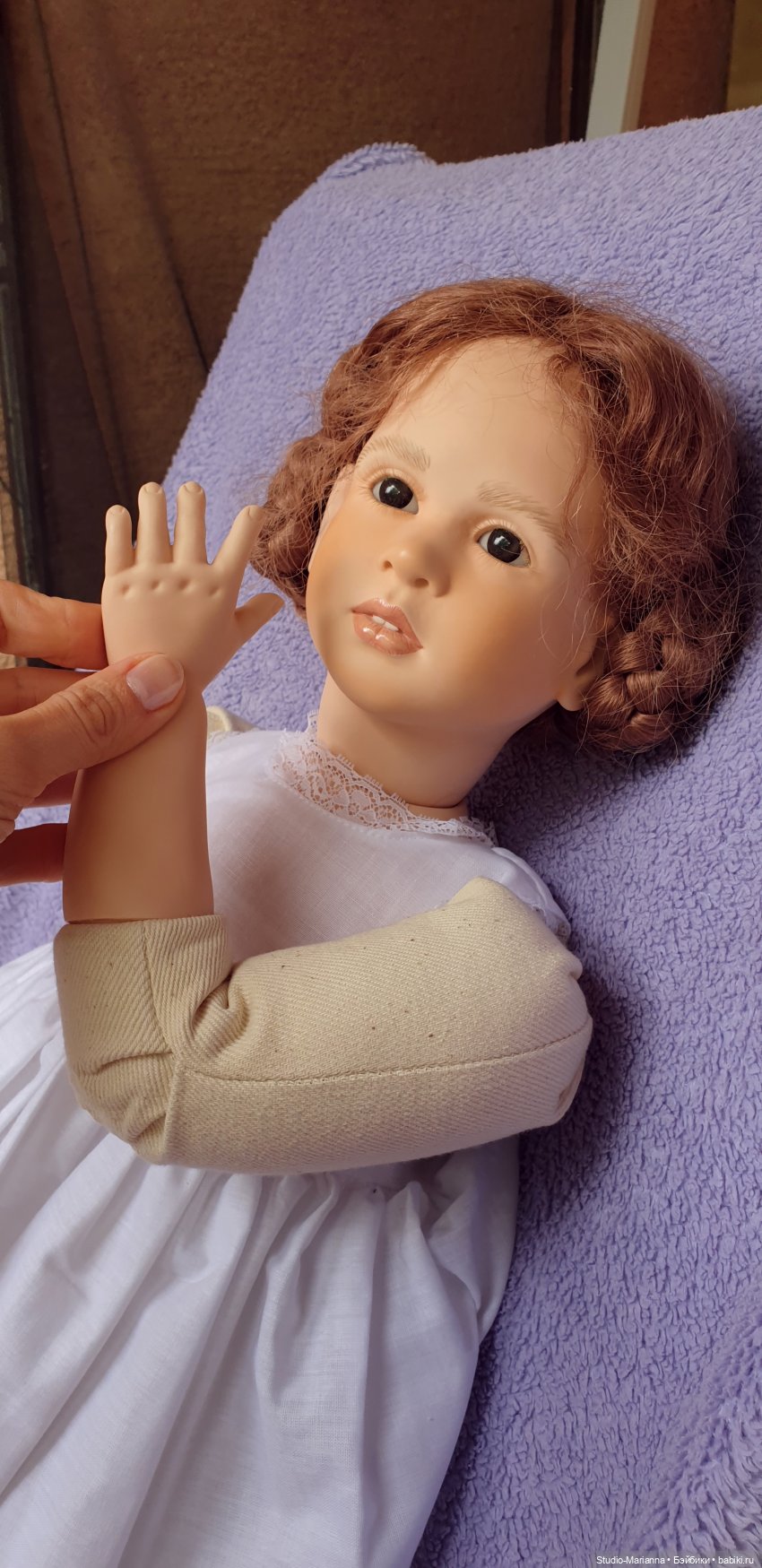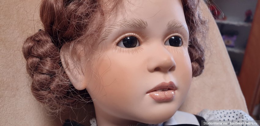 Девочка выполнена из винила (голова, грудная пластина, руки ноги на треть. Тело мягконабивное, очень хорошего качества (натуральная шерсть, очень плотная). Волосики натуральные, очень красивые карие глазки. Отлично сохранился мейк. Губки я покрыла защитным лаком для большей защиты цвета. Благодаря уникальному строению тела девочка может сгибать ручки ножки в локтях, коленочках (смотрите фотографии).