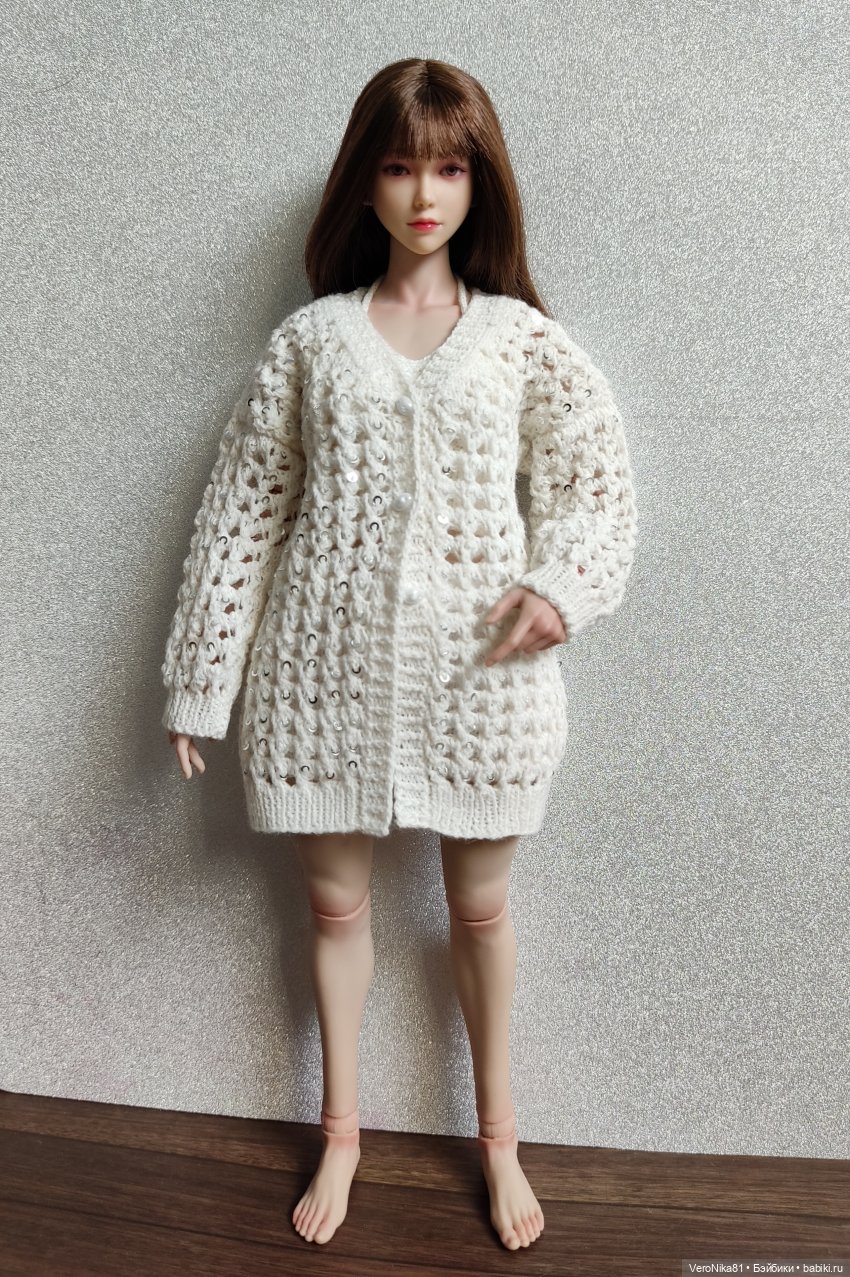 3) Ажурный вязаный белый кардиган — сетка по мотивам Brunello Cucinelli. Узор сложный и эффектный, связан без изменений на размер куклы. Пайетки 2 мм ввязаны в полотно на лицевой стороне изделия за доп.ниточку. Пряжа — 70% хлопок/30% лавсан. Застегивается на стеклянные пуговицы-бисер.