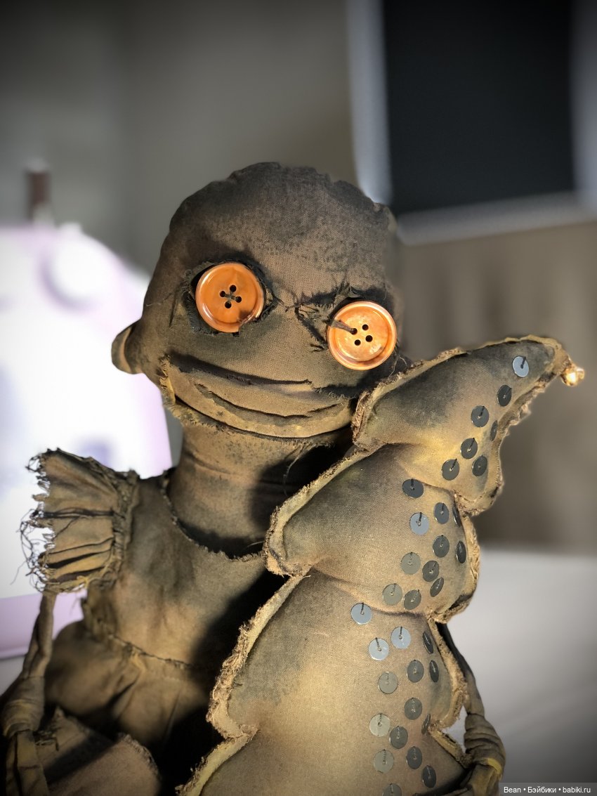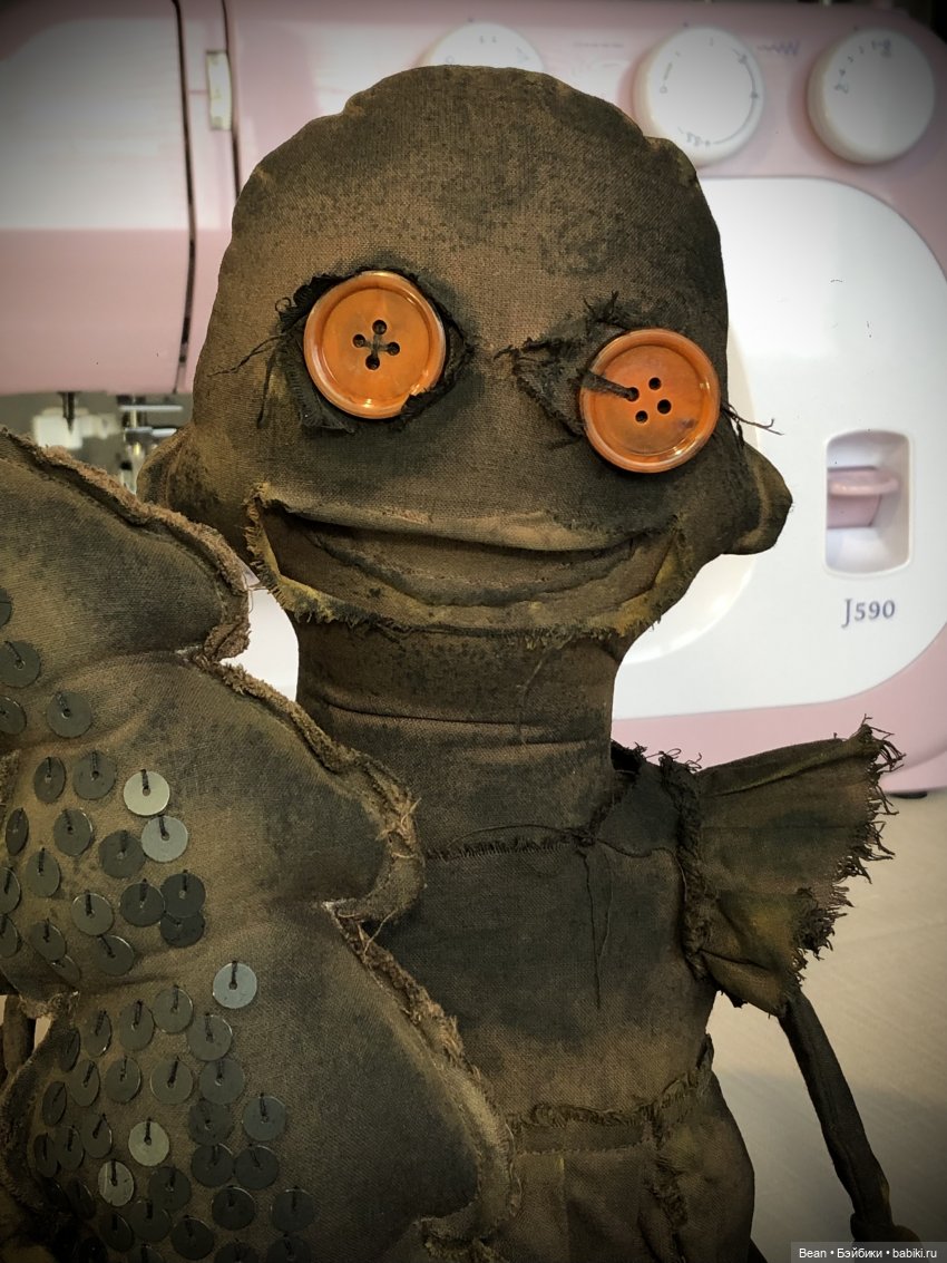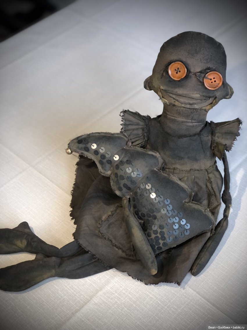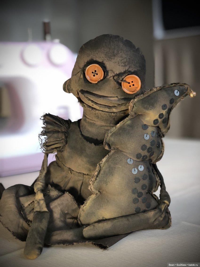 Жуткая чердачная тряпичная кукла с ёлкой в технике экстремальный примитив. Рост ~53 см. Из хлопка, окрашено. Набивка основы синтепух, а в руках и ногах, в нижней части, гранулят (стеклянные шарики). Глаза пуговицы винтажные. Шапка флис. Платье съёмное, на платье дыра, и карман в котором камень. На ёлке чёрные матовые пайетки и ржавый бубенчик, приятно звучит. Ручная работа. Сидит без опоры. Сухая чистка.