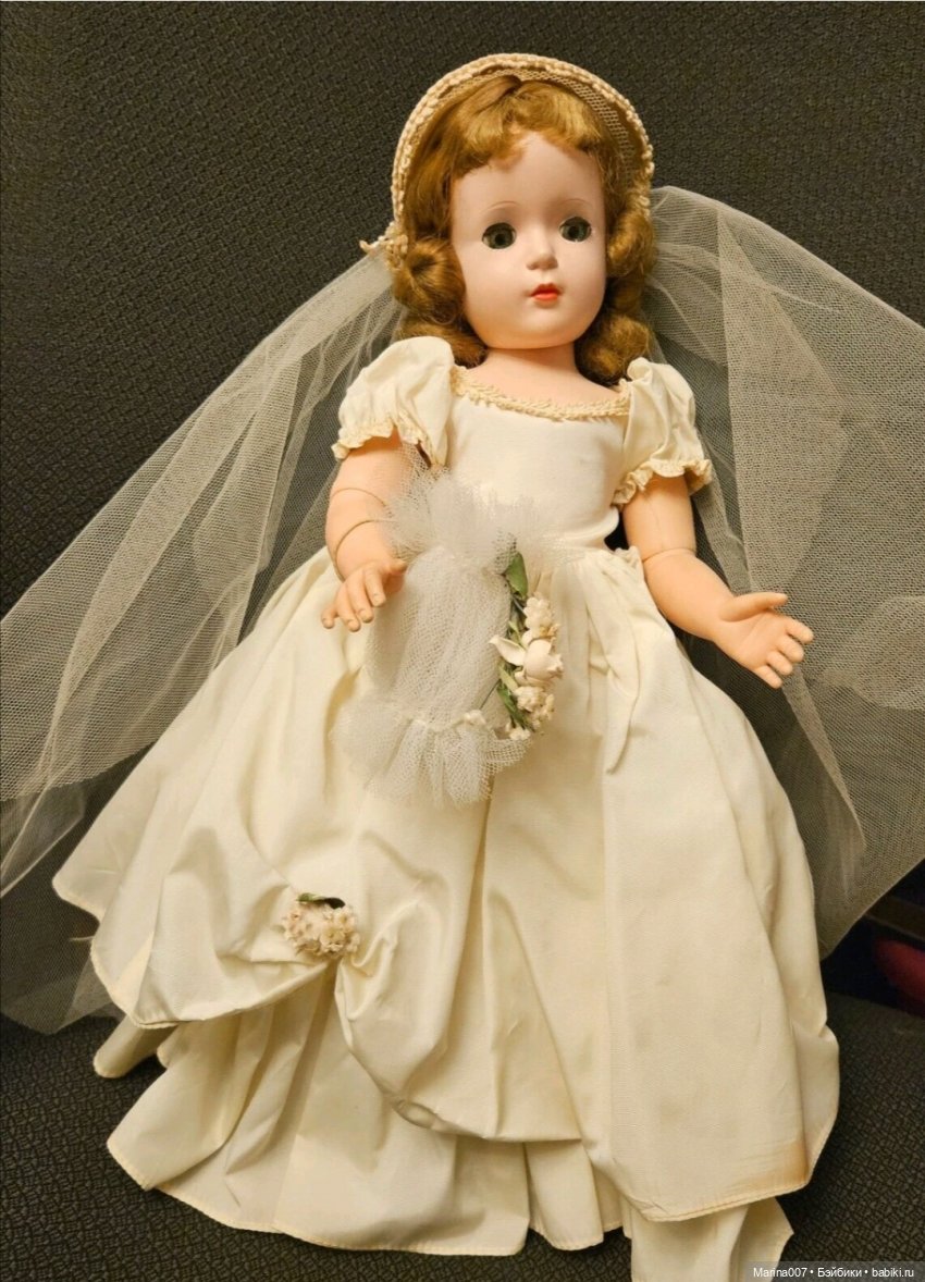 Винтажная невеста от Мадам Александр 50-60 х годов в хорошем состоянии для своих лет. Куколка чистенькая без посторонних запахов, хранилась бережно в стеклянной витрине. Голова, тело, ножки хартпластик. Ручки резиновые. Глазки спящие, работают синхронно. На левом глаза немного потеря ресничек. Мейк в идеале. Волосы парик приклеен. Ручки и голова крепятся на резинку. Внутри тела железный механизм, который крепит ножки. Шарниры работают хорошо не разболтаны, но на левой ножке с внутренней стороны под коленкой трещина (на фото отразила). Механизм ходьбы отсутствует. Самостоятельно стоять не может, только со стендом или опорой. Родное свадебное платье со следами времени. Резинка на рукавах, подьюбнике и трусиках рассохлась. Платье было постирано, удалены всё многочисленные скрепки, на которых держались стебельки от цветов, оказывается их не пришивали, а крепили степлером. Головное украшение такая же беда, только скрепок было в два раза больше, поэтому есть дырочки. Фата без повреждений и без дырочек. Хватитило сил только постирать, отгладить наряд, а вот до ума так и не довела наряд. Пока родное платье приводила в порядке, куколка стояла в антикварном наряде от мастерицы Ирины, покупала специально для неё, продаётся вместе с куколкой. Ажурные зонтик тоже, функциональный, раскрывается. Ободок с жемчужиными бусинами привезёт с собой. Туфельки у неё родные, белые носочки современные. Куколка живет у меня 8 лет в стеклянной витрине, скучает, на улицу не выносилась, не купалась. В переодевании участвовала только один раз, когда наряд для неё получила. Пришло время отпустить красотку в новый дом, отпускую с лёгким сердцем. Может найдётся мастерица и вернёт родному аутфиту былую нежность и красоту. Дополнительные фотографии пришлю по запросу, спрашивайте, пожалуйста, через кнопку Уточнить, всегда рада общению и новому знакомству. Авито доставкой отправляю, но посылочка будет долго в пути, примерно 40-50 дней. Со своей стороны гарантирую надежную упаковку. Благодарю за внимание 🌹.