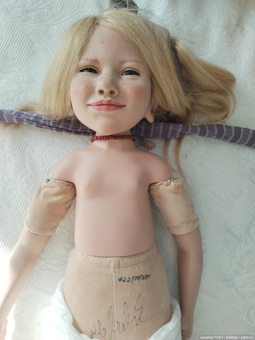 Винил, набивная часть шортиков, паричок из натуральных длинных волос, глазки – стекло Лауша. Одета в красивую вышитую блузу, шортики, чулочки с пайетками, бусы со свинками-амулет Zwergnase, шарфик, бант на голове.