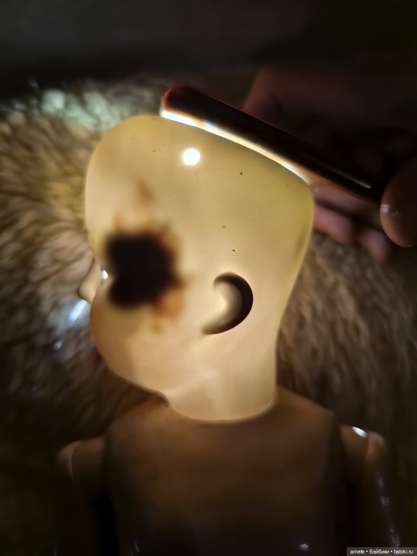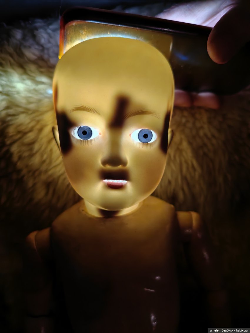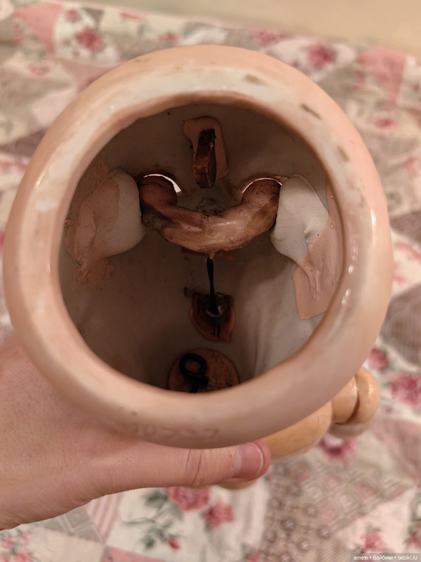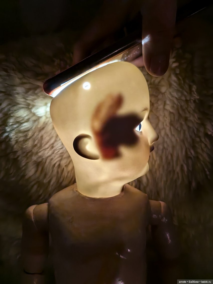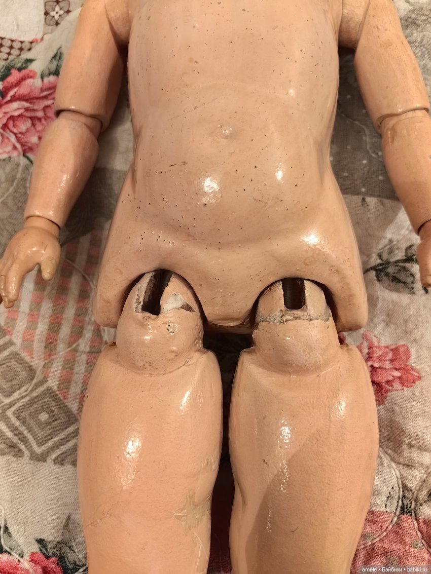 Тело антикварное, деревянно-композитное. Могу предположить, что родное, так как по типу оно правильное для Ревало. На туловище есть старая точечная реставрация на ноге — укреплен композит. Туловище сохранило родное покрытие. Все сколы законсервированы. Куколка хорошо держит позы.