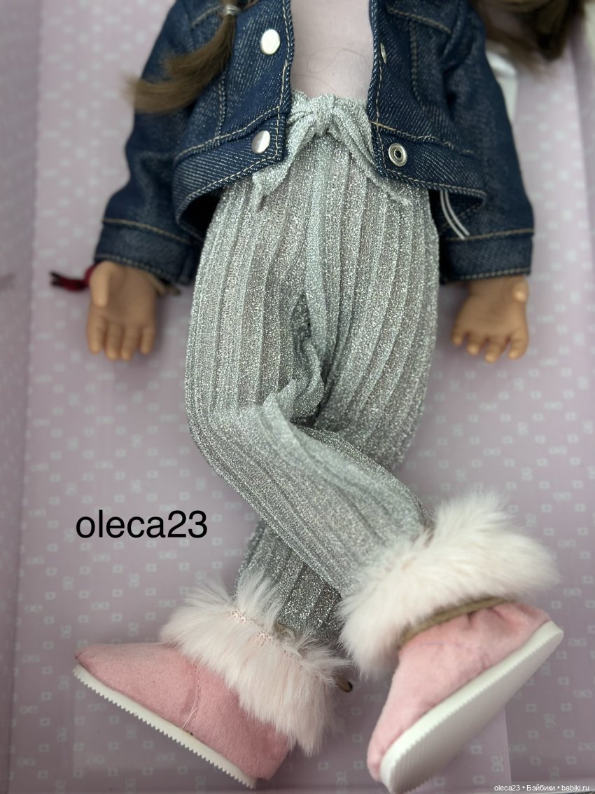 Малышка Грета стильная девочка! На ней блестящие брюки с модными складками, и стильная джинсовая куртка, на голове лента для волос, а её угги с меховой отделкой, прекрасно завершают её модный образ.