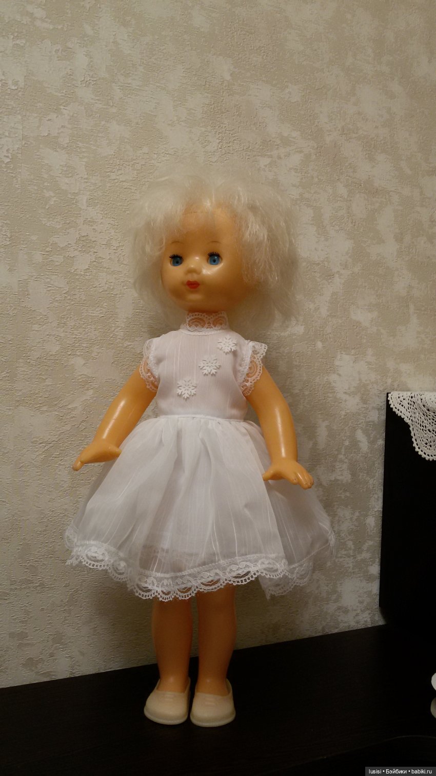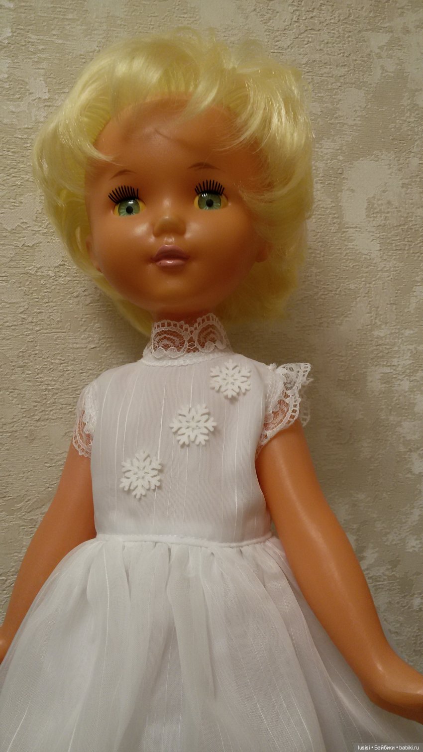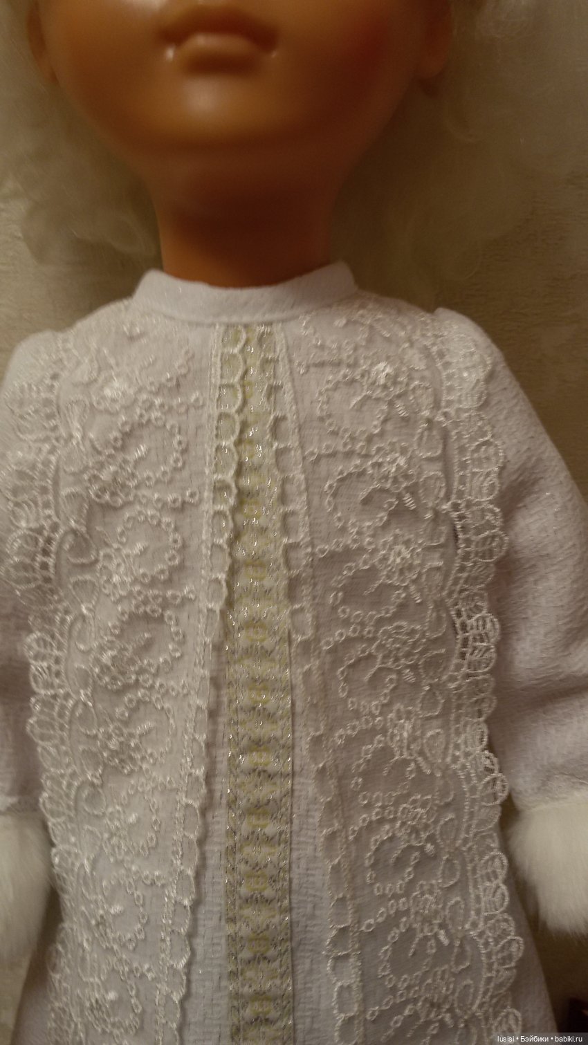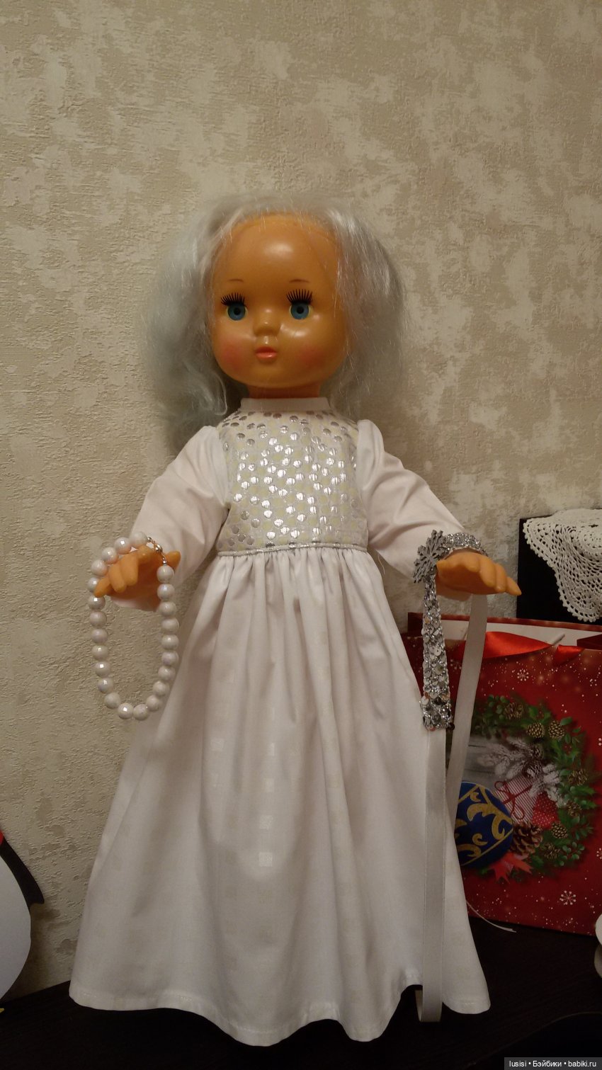 1 фото — Новогоднее платье- снежинка. Подойдёт куклам ростом 50-53 см., по талии 21 см… Цена 450 р.--------------------------------------------------------------------------- 2 фото — Очень красивый костюм-платье для ваших красавиц на Новый год. Сшито из хорошей белой ткани с опушкой из искуственного меха, с добавлением кружев, тесьмы. Материал современный. Платье одно, но подходит разным куклам ростом 60- 75 см.( Наташам, Нинам, Женям и др.). Цена 600 р. ------------------------------------------------------------3 фото- Белое платье подходит куклам 65-77 см. Цена 500 р! ПРОДАНО!