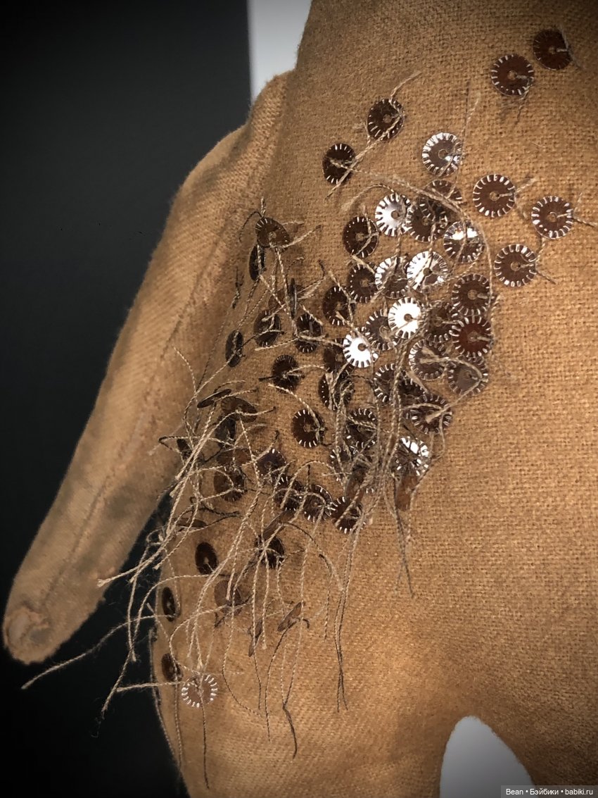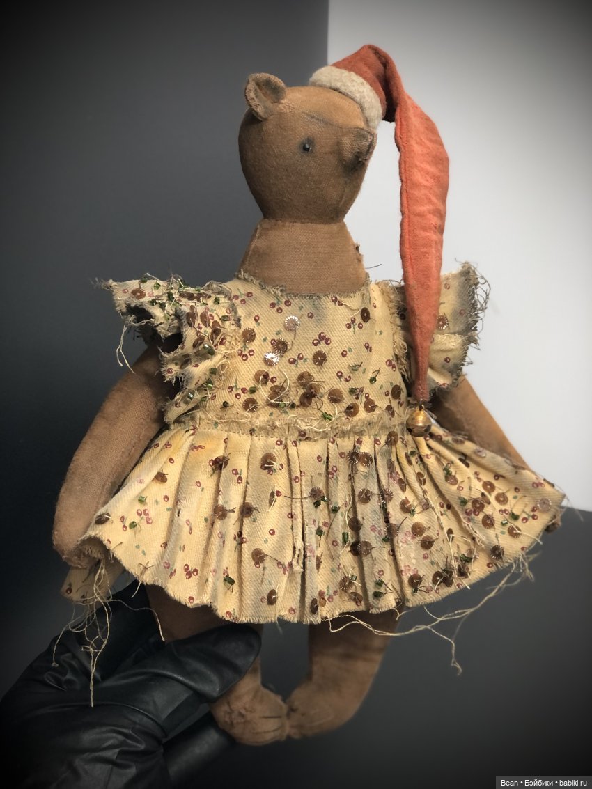 Чердачный медведь с ёлками в технике экстремальный примитив. Медведь коричневый, коллекционный, интерьерный, винтажный вид. Высота ~26 см. Из хлопка, тонировано, интенсивно состарено, наполнитель синтепух. Медведь из фланели, приятный на ощупь. Платье съёмное, расшито пайетками и бисером, под платьем на медведе ещё пайетки. Верхние лапы подвижные, на нитяном креплении, в остальном медведь статичен (стоячее положение). Не стоит без опоры. На колпаке и ёлках ржавые бубенчики, приятно звучат. Ручная работа. Сухая чистка.