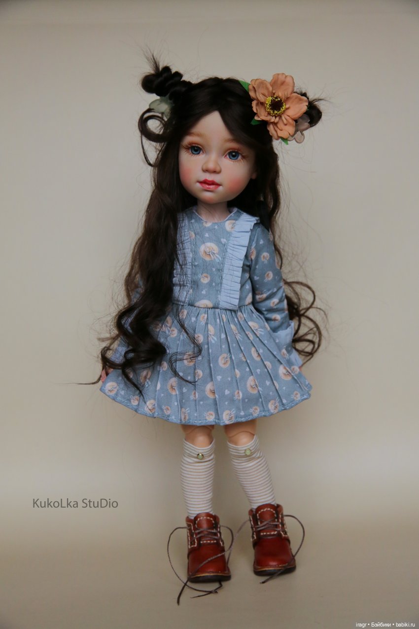 Волосы парик из мохера козочки, волосы длинные, волнистые каштанового цвета. Парик сидит плотно на голове куколки.