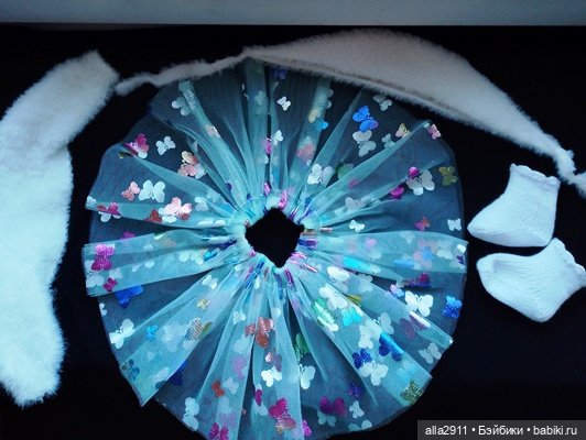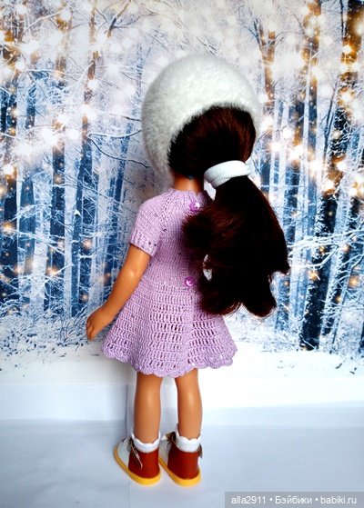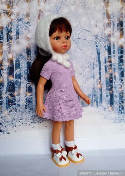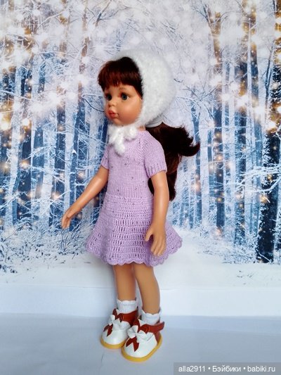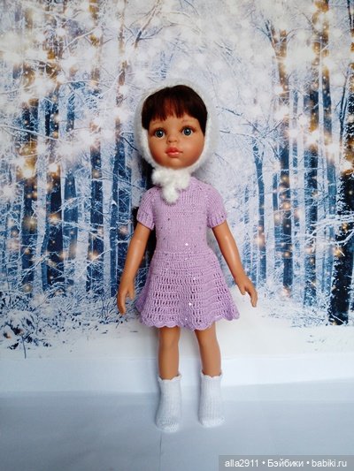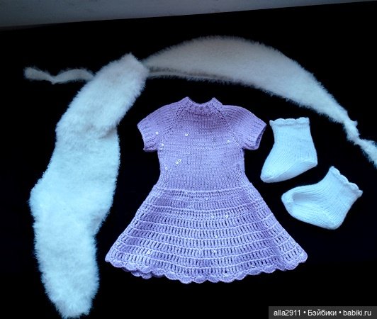 Представляю новый комплект для Паолочки из пяти предметов.Это нижнее платье сиреневого цвета с пайетками, пышная юбочка из яркого фатина с рисунком, болеро и ретро чепчик из пушистой пряжи и вязаные носочки из очень тонкой хлопковой пряжи.