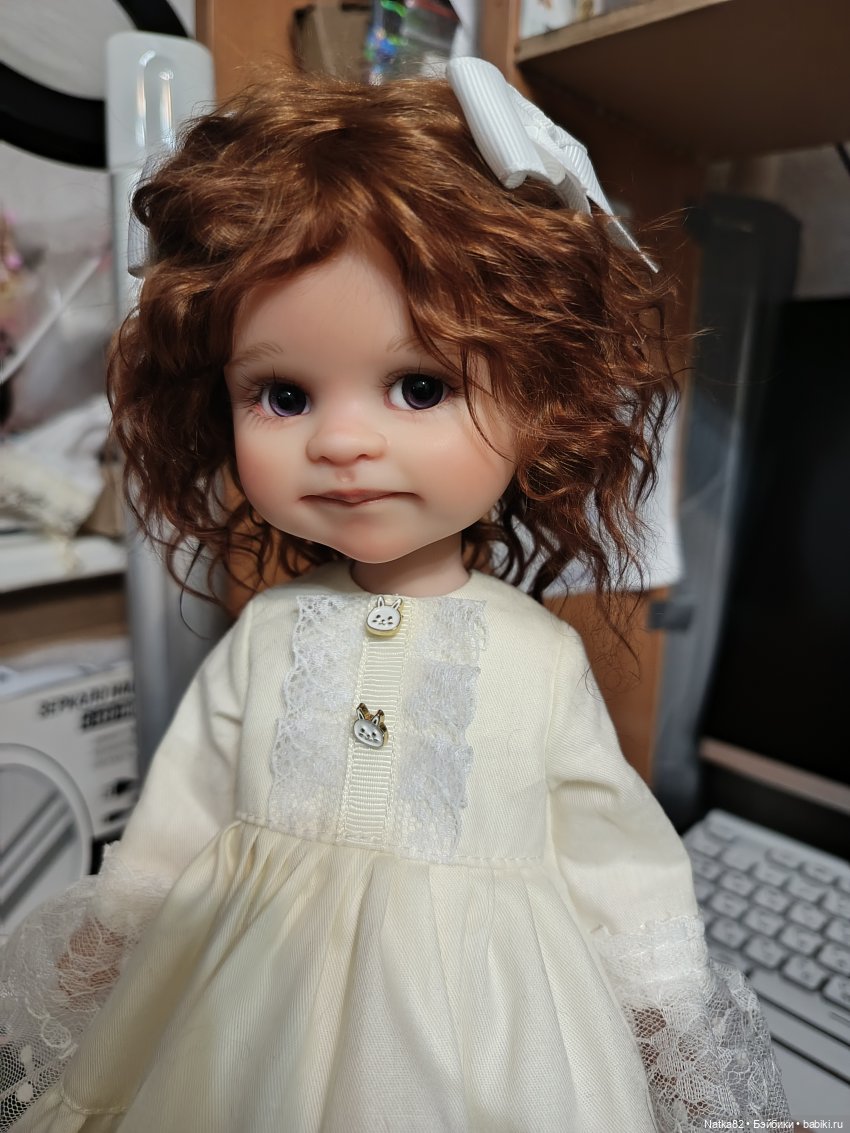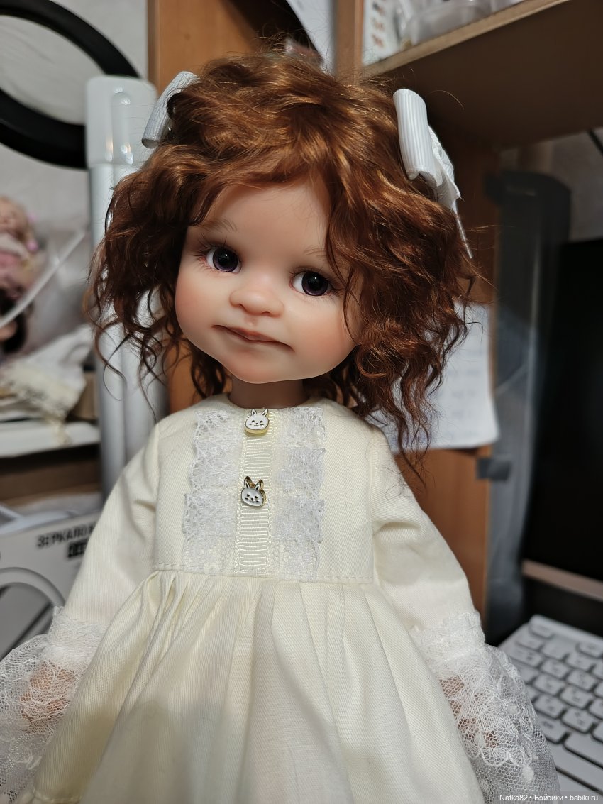 Выполнен карвинг носика и ротика. Мейк закреплён. Паричок из локонов козочки, съёмный. Глаза стеклянные. Цвет на фото немного искажается, на самом деле не такая яркая. Девочка нежная. В комментариях вставила фото с рабочего стола. Продаётся на родном теле в аутфите. Можно купить на шарнирном теле- 15000 руб. Натяжка хорошая, тело не проклеено, на шарнирах остаются белёсые следы. Кисти рук на магнитах, ещё одна пара в комплекте. Все вопросы пожалуйста в лс. К покупке подходите обдуманно, возвратов нет. Отправляю в течении 2-3 дней с момента оплаты. Оплата на карту сбербанка. Если нужна страховка, пишите сразу.