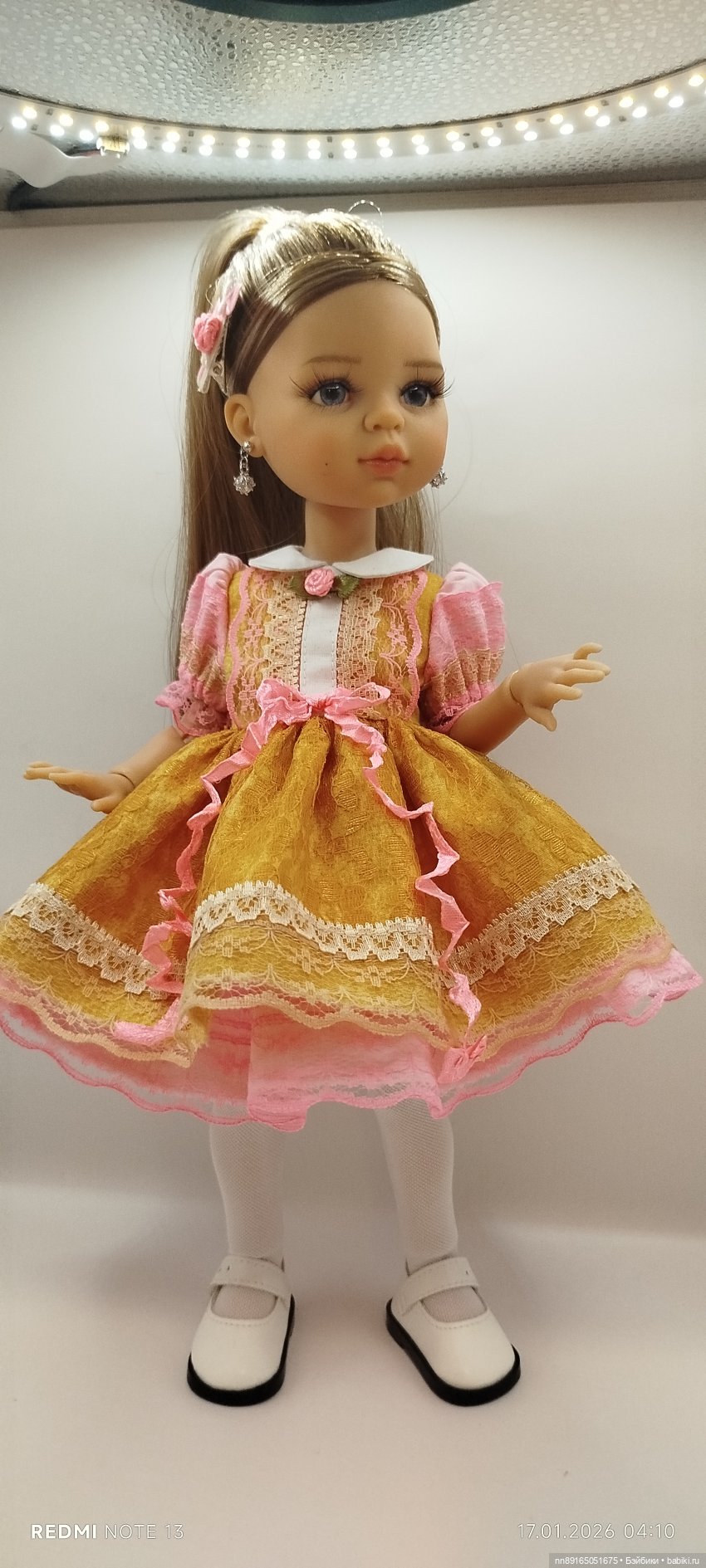 Юбка платья двойная: верхняя хлопковая покрыта гипюром, это создает эффект парчи, декорирована двумя видами бежевого кружева, нижняя составная-верх из двойного слоя белой подкладочной ткани, нижняя часть из розового ранфорса, декорированного широким розовым кружевом и фигурной машинной строчкой.