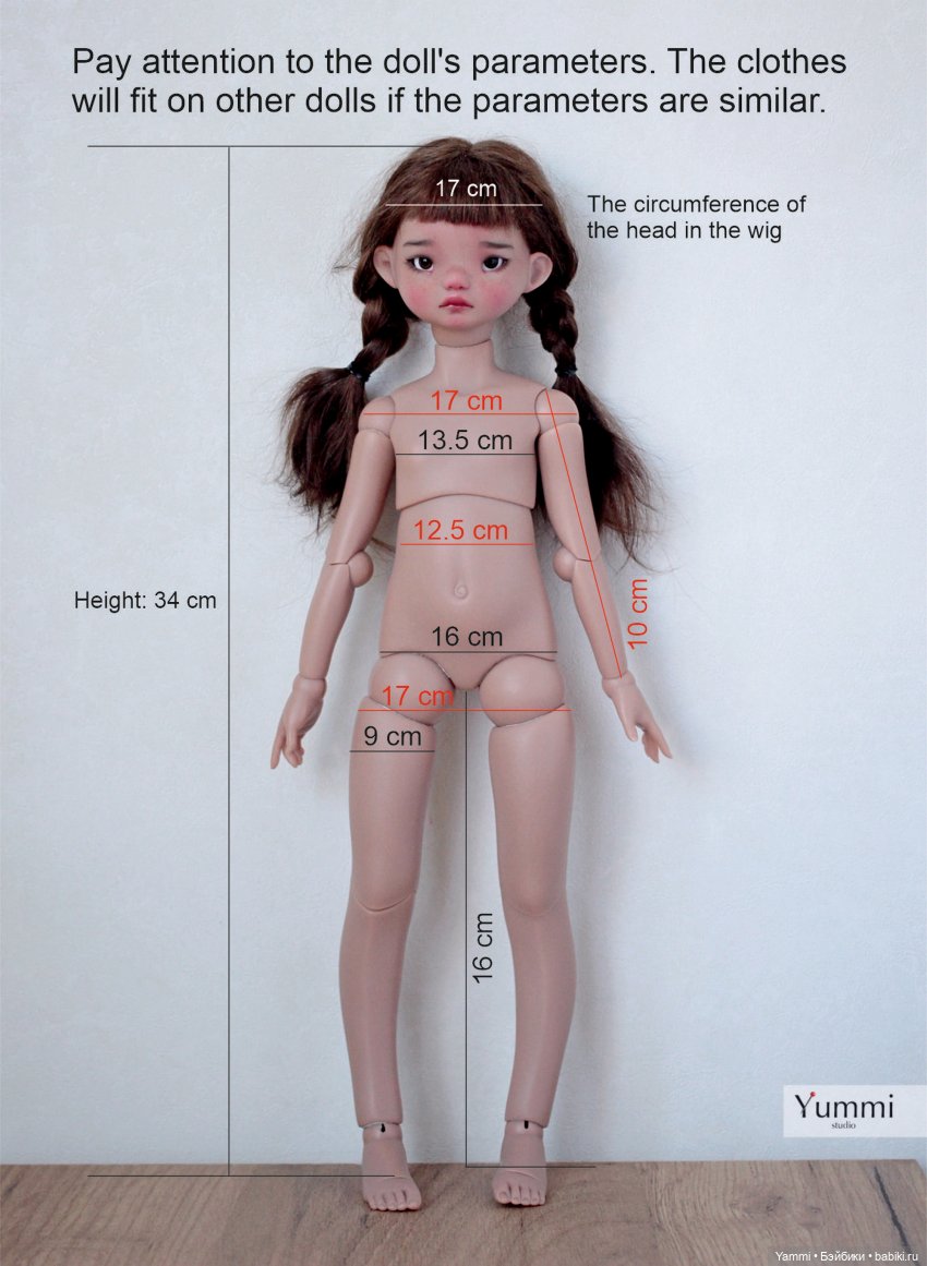В комментарии прикреплю фото с размерами кукол