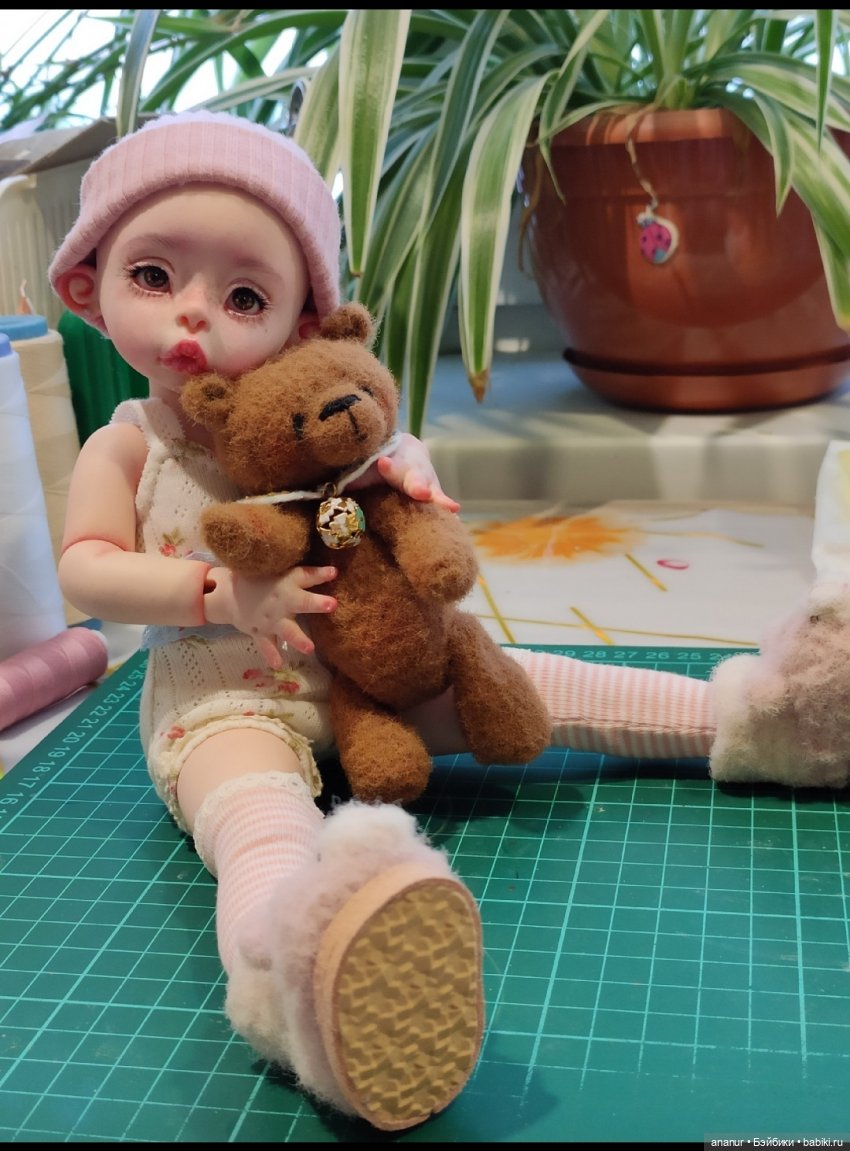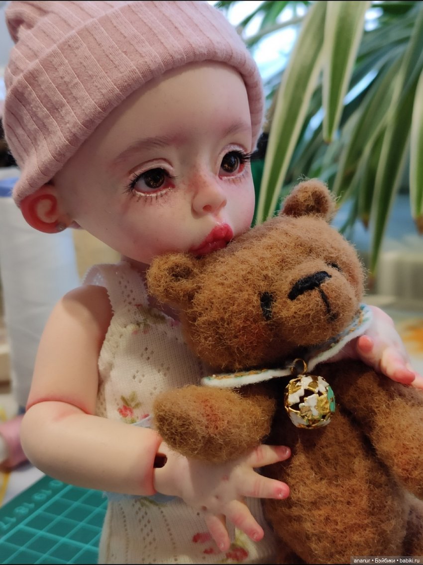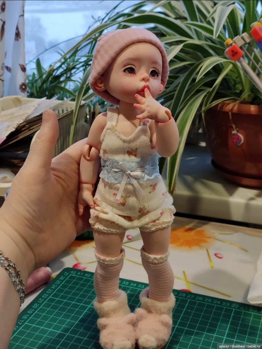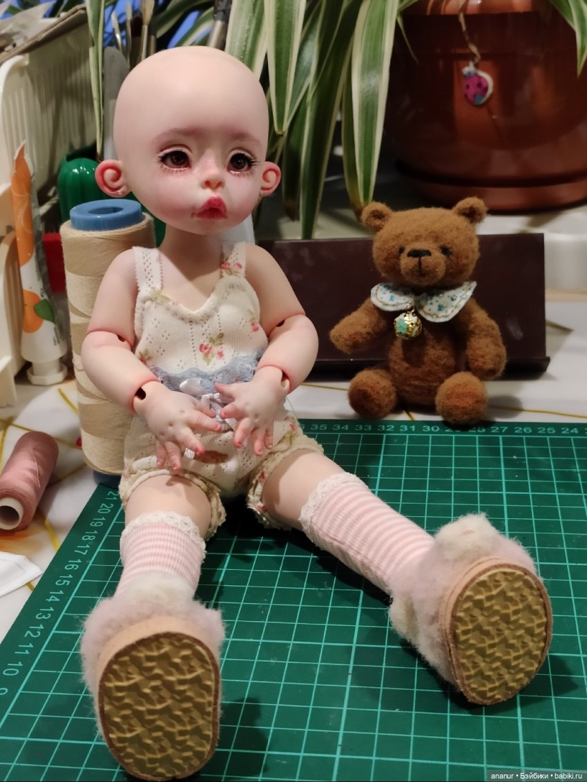 Девочка выполнена в смешенной технике. Верх тела бжд — ручки, голова и верх торса на резинке. Сам торс твердый, слеплен из La Doll. Ножки из запекаемой глины, НЕ ПОДВИЖНЫ ни в коленях, ни с щиколодке. Авторская роспись глаз. Волосы приклеены к голове, НЕ ПАРИК.