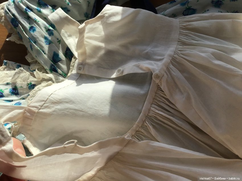 Сшито из натуральных винтажных ( ситец, ленты) и антикварных ( кружево хлопковое валансьен, стеклянные пуговки на сорочке) материалов, подклад платья и сорочка из тончайшего современного батиста ( слегка затонирован).