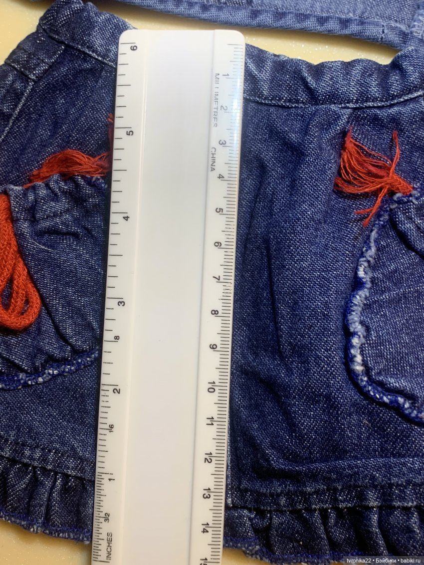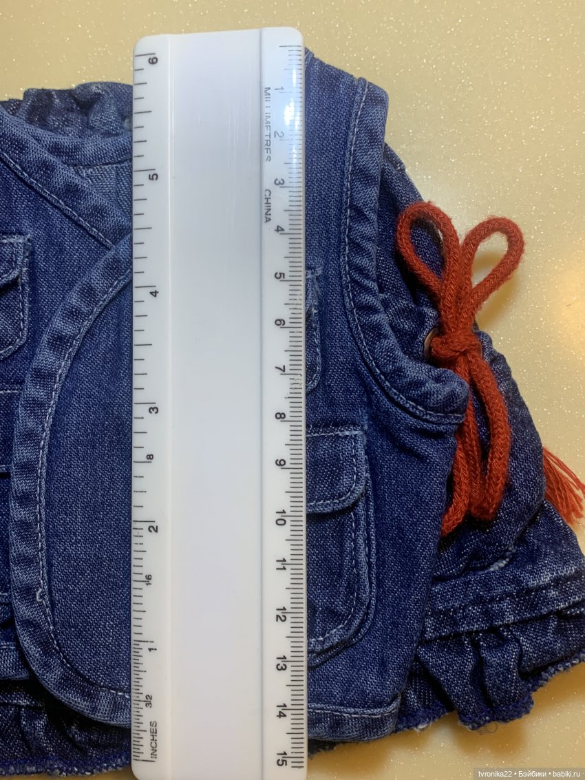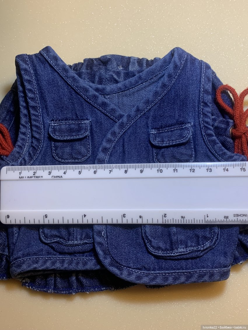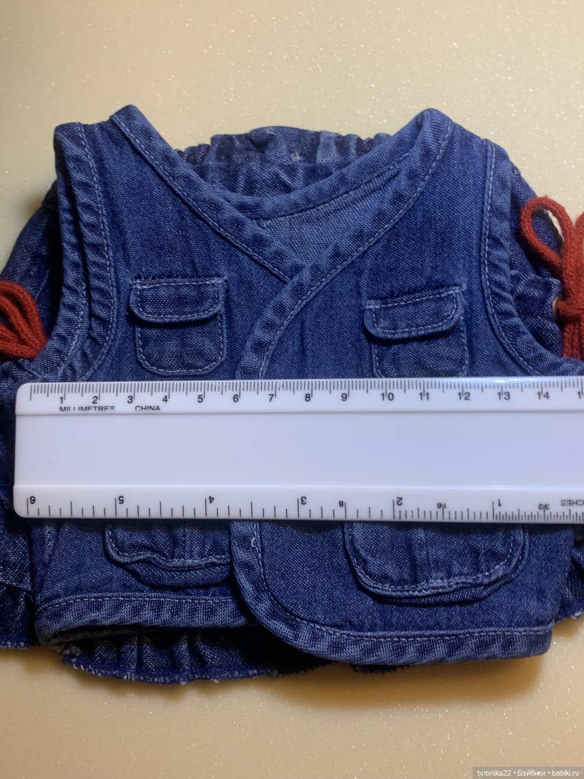 Джинсовый костюм от Аннет Химштедт. На очень больших кукол, от 65 см, я думаю. Состоит из юбки с кармашками и жилетки, на жилетке сзади, на кармашке пришита кокетливая рыбка ). На кармашках юбки бантики.Все кармашки функциональны и довольно глубокие. Качество этого аутфита безупречное, всё сшито прочно, надёжно и очень красиво. В швы обоих предметов аутфита вшиты фирменные бирки с подписью Annette Himstedt, Костюм моими куклами не носился, поскольку у меня таких больших кукол уже давно нет, пролежал в пакете в шкафу несколько лет. Состояние его отличное. Фото с размерами размещу в комментариях. Спасибо, что заглянули в мой шопик.