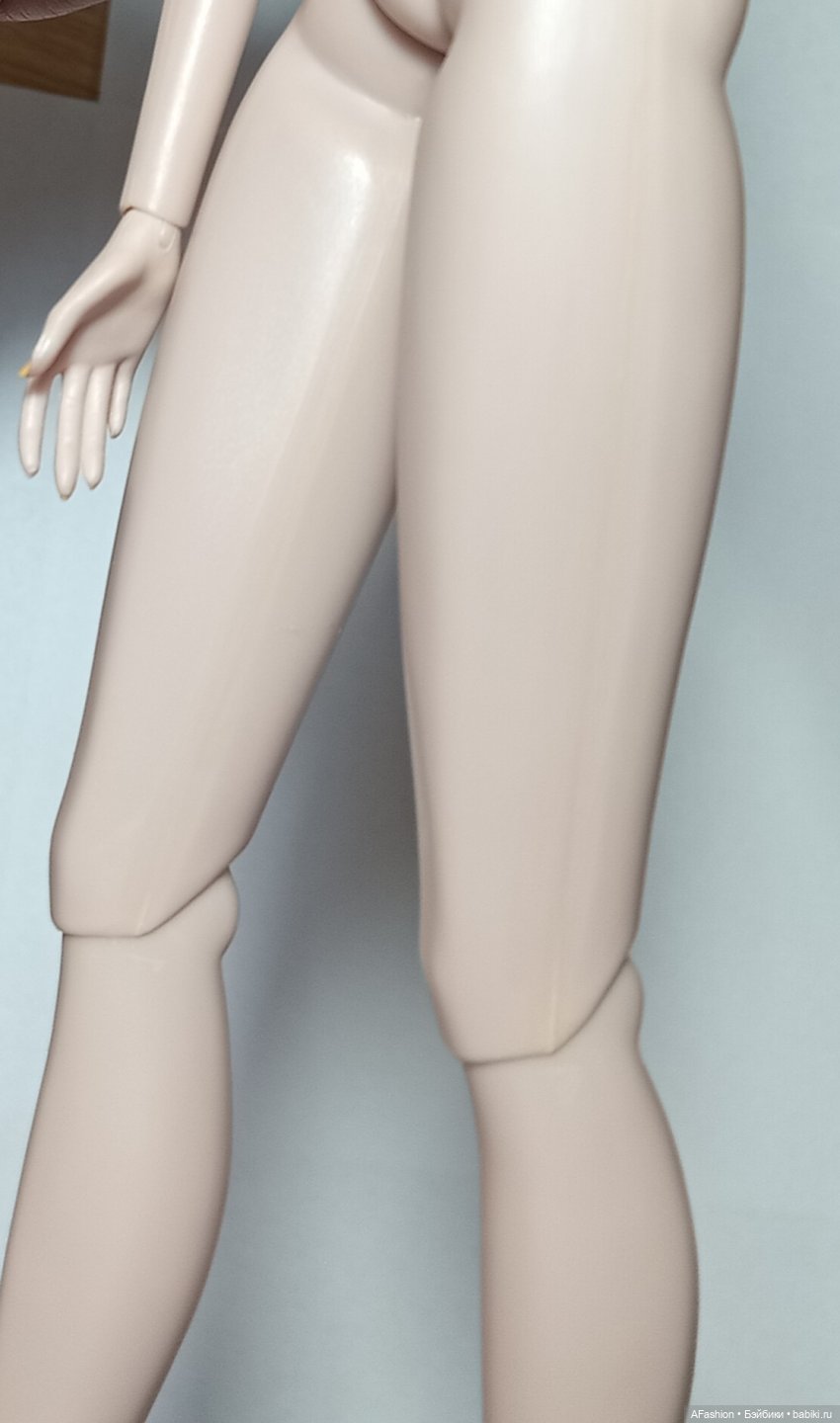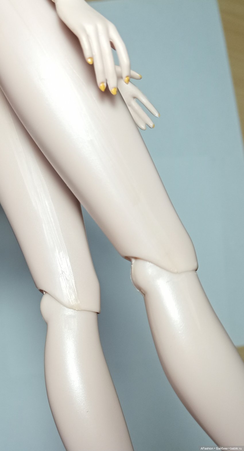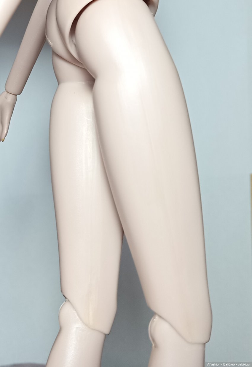 У куклы есть нюансы — кажется, желтоватые швы; типа лака на ноге; выемка на лице сбоку; неровности у основания головы; грудной шврнир держит форму только назад, один бедренный шарнир чуть слабоват.