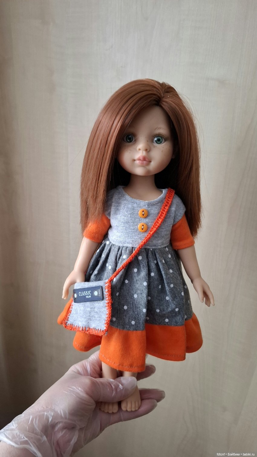 Платье сшито из трикотажа. Верх платья на подкладе, застегивается на аккуратные маленькие кнопочки. Наряд приобретала вместе с куколкой у продавца.