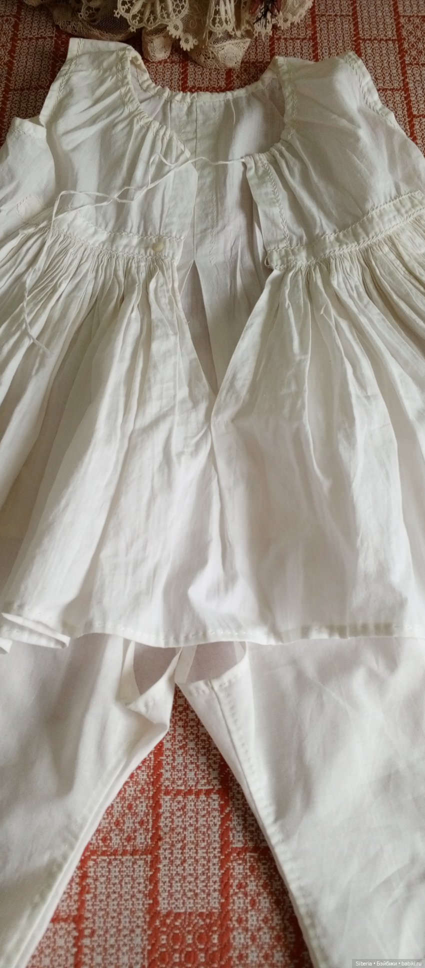 Продам шикарный наряд для большой куклы ростом 72-76 см. Все материалы натуральные. Полностью ручная работа. Панталончики из х/б батиста сшиты по антикварному образцу — длина 35 см. Нижняя рубашечка и юбка — из антикварной крестильной рубашки. Рубашечка украшена ручной вышивкой. Длина по центру переда 32 см, по спинке 37 см. Юбочка — очень пышная, с большим количеством кружева и мелких складочек — длина 35 см. Платье сшито из итальянского шелкового батиста, украшено дорогим антикварным кружевом пр-ва Франция. Платье- на батистовом подкладе. Застёжка — пуговки из ракушки+ навесные петельки. Длина по центру от горловины 48 см. Длина рукава 20 см. Головная накладка на проволочном каркасе- так же антикварное кружево. Наряд шился на куклу ростом 74 см ( она продана). Мерки куклы: обхват шеи 20 см. Обхват груди 39-41 см. Обхват талии 35-37 см. Обхват бедер 42-44 см. Вся одежда сшита с учетом на свободное облегание- можно регулировать объём с помощью завязочек и пояса. Дополнительные фото — по запросу. Оплата на карту Сбербанка. Доставка с трек- номером включена. Возможна отправка через Яндекс- маркет.