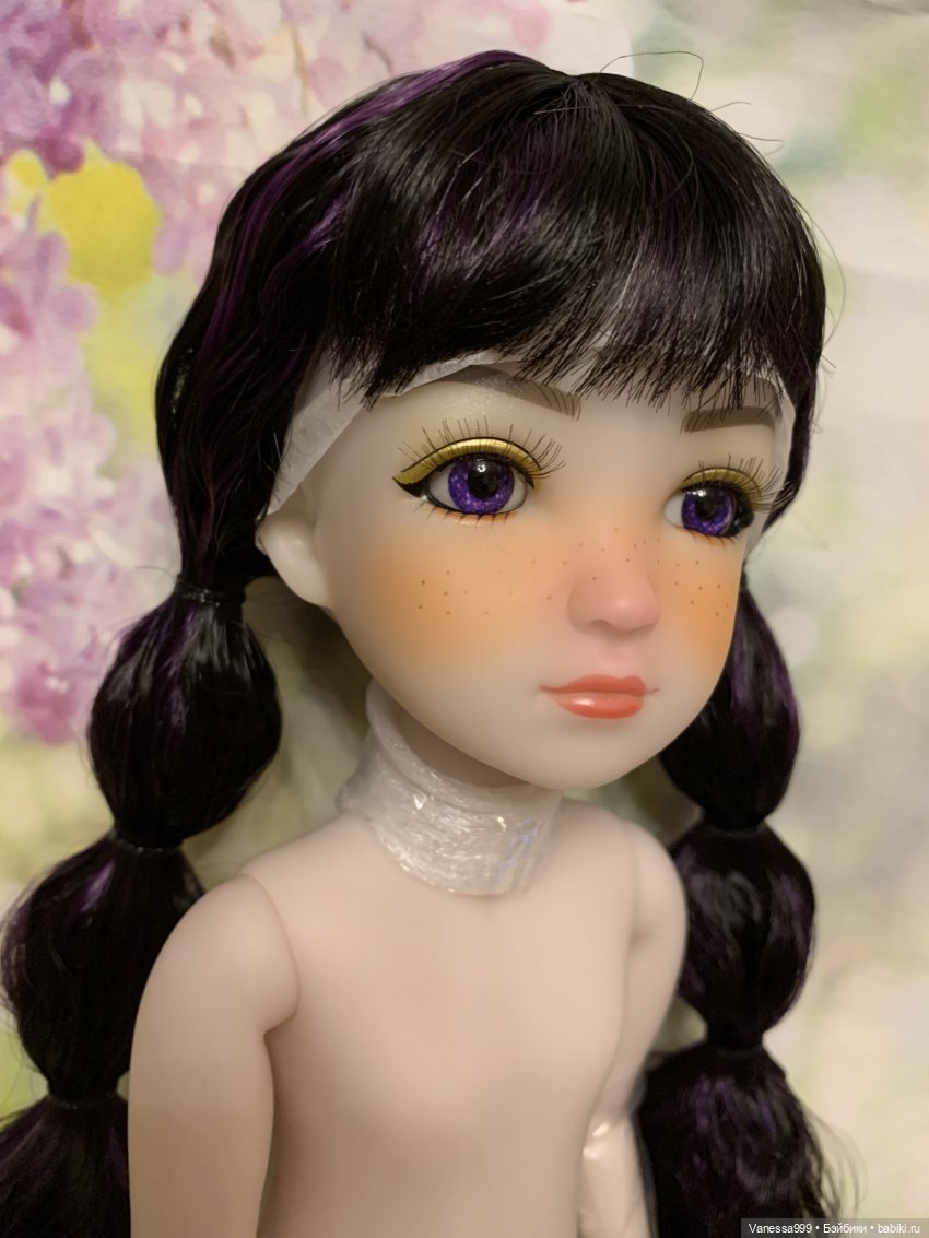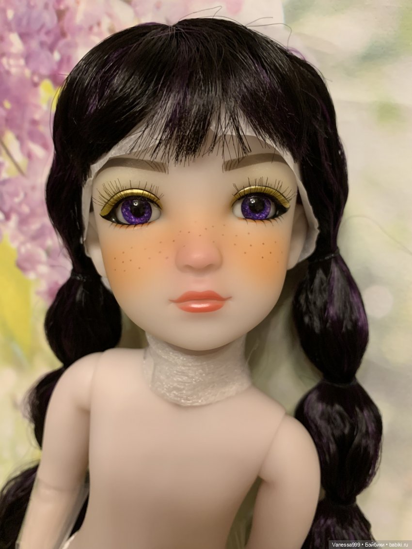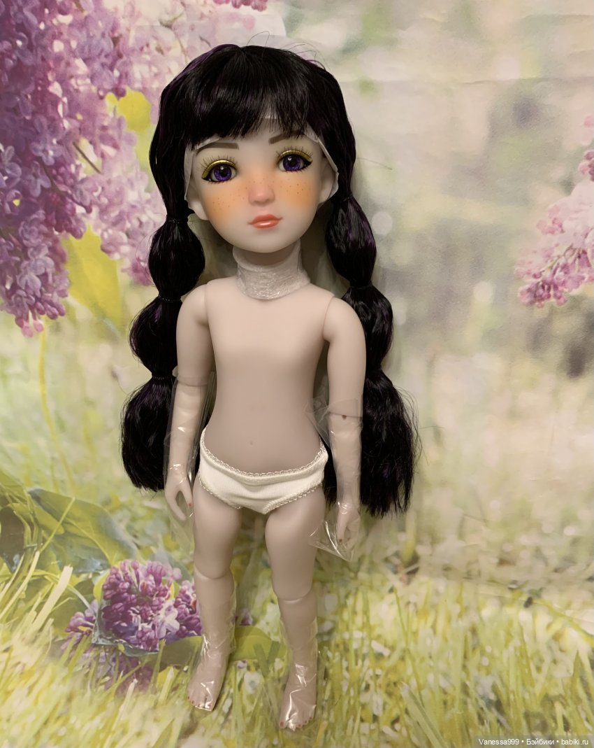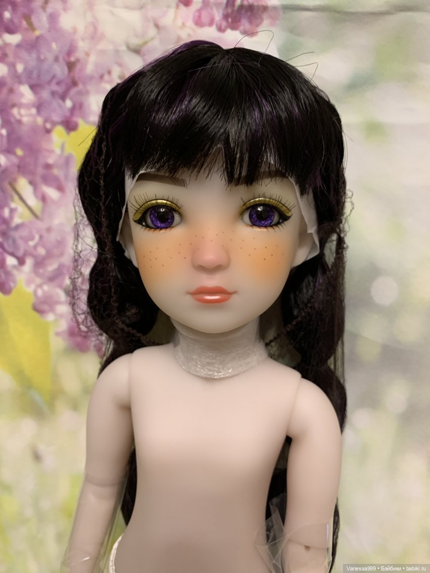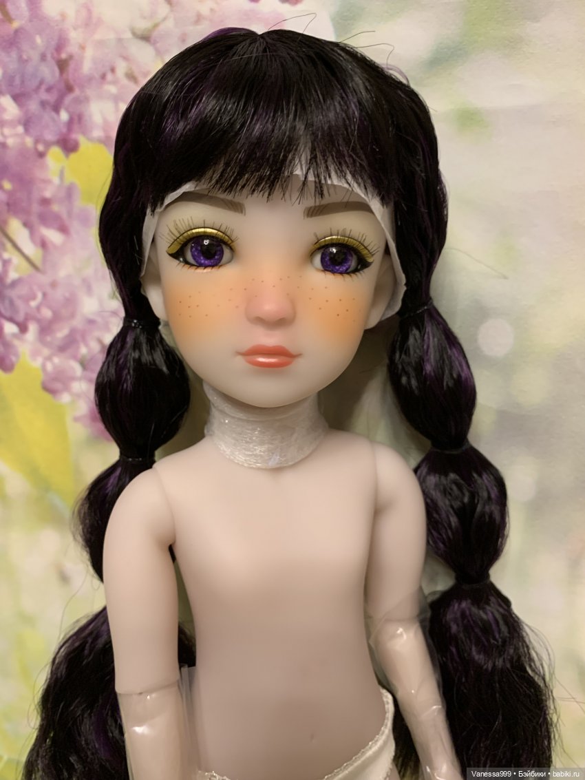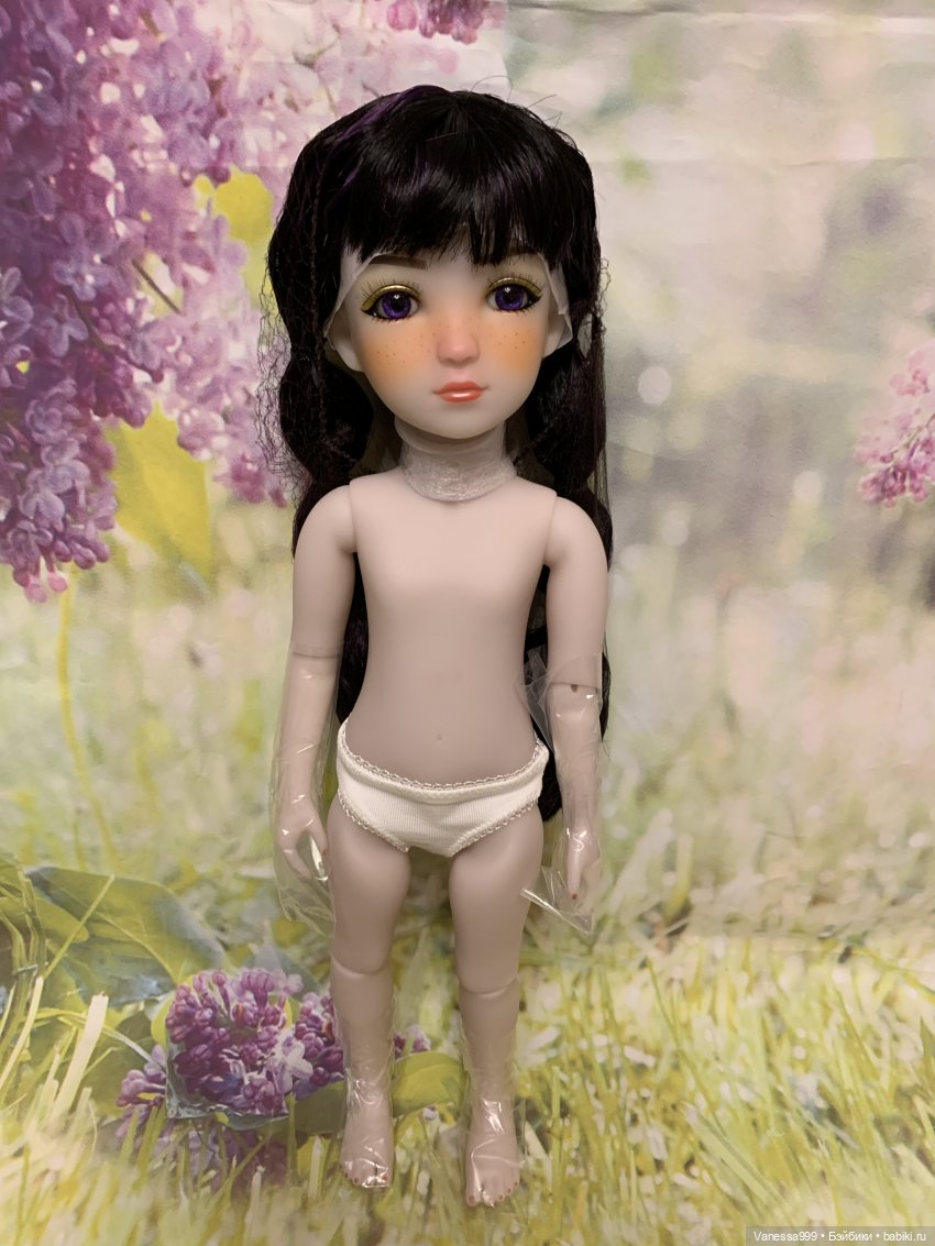 Рост 37 см.Полностью виниловая, шарнирная,9 точек артикуляции.Собрана на резинку.Натяжка очень хорошая.Стоит и сидит самостоятельно.Волосы-парик съёмный.Глазки фиолетового цвета вставные не закрываются.Мейк не такой яркий как на фото получился.(фотографировала ночью при искусственном освещении). На животике еле заметное пятнышко.Лежал аутфит и через бумагу появился чуть окрас.Возможно можно вывести Базироном.