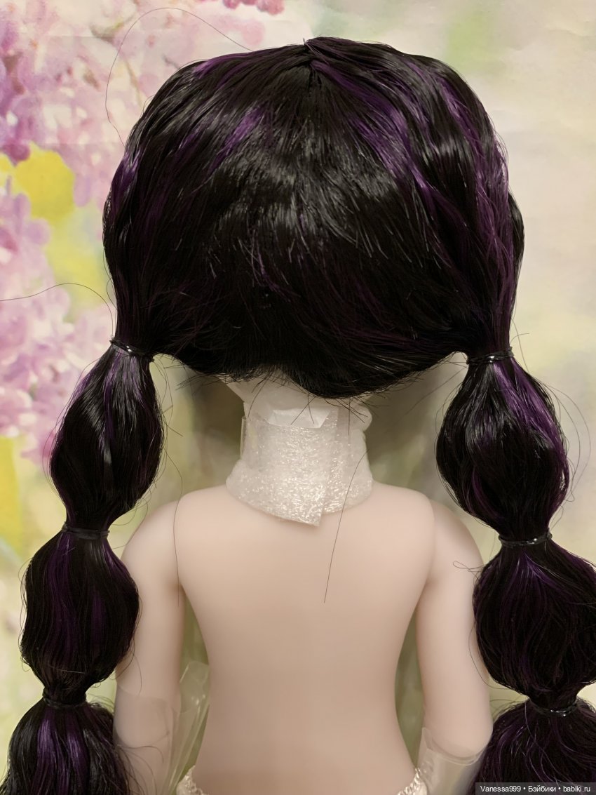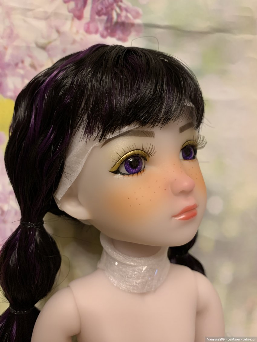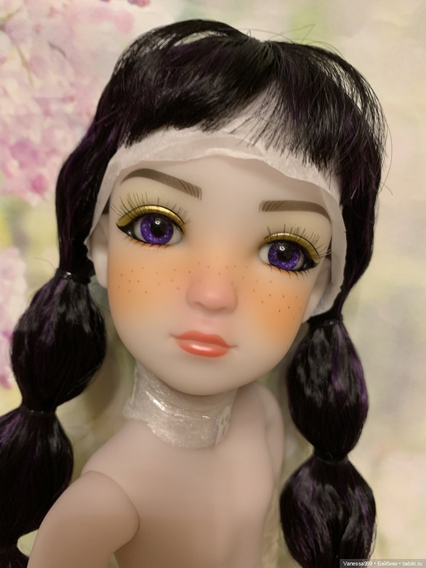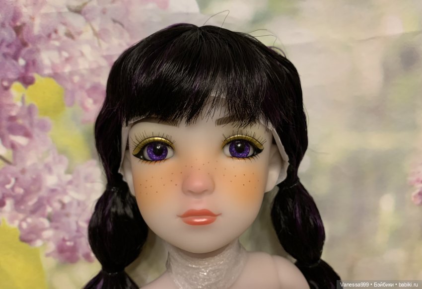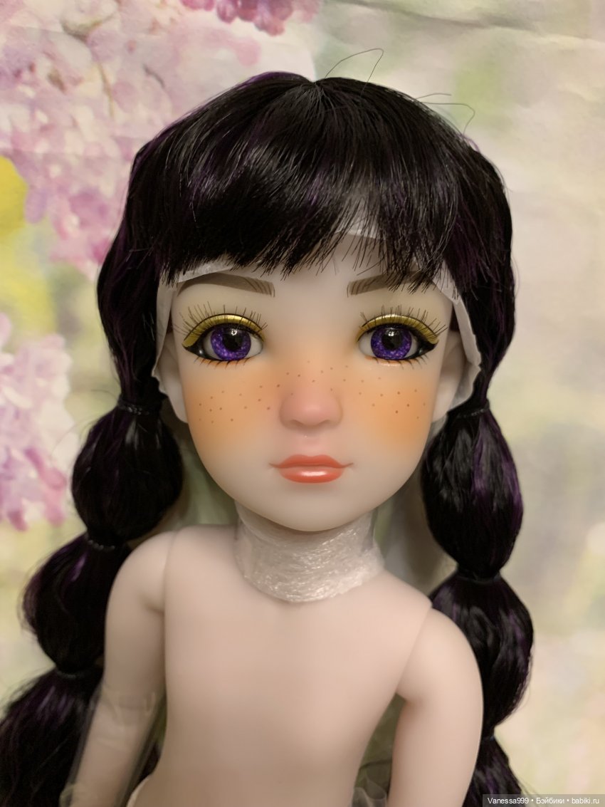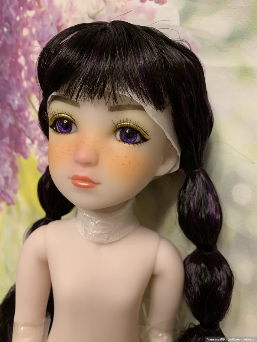 Рост 37 см.Полностью виниловая, шарнирная,9 точек артикуляции.Собрана на резинку.Натяжка очень хорошая.Стоит и сидит самостоятельно.Волосы-парик съёмный.Глазки фиолетового цвета вставные не закрываются.Мейк не такой яркий как на фото получился.(фотографировала ночью при искусственном освещении). На животике еле заметное пятнышко.Лежал аутфит и через бумагу появился чуть окрас.Возможно можно вывести Базироном.
