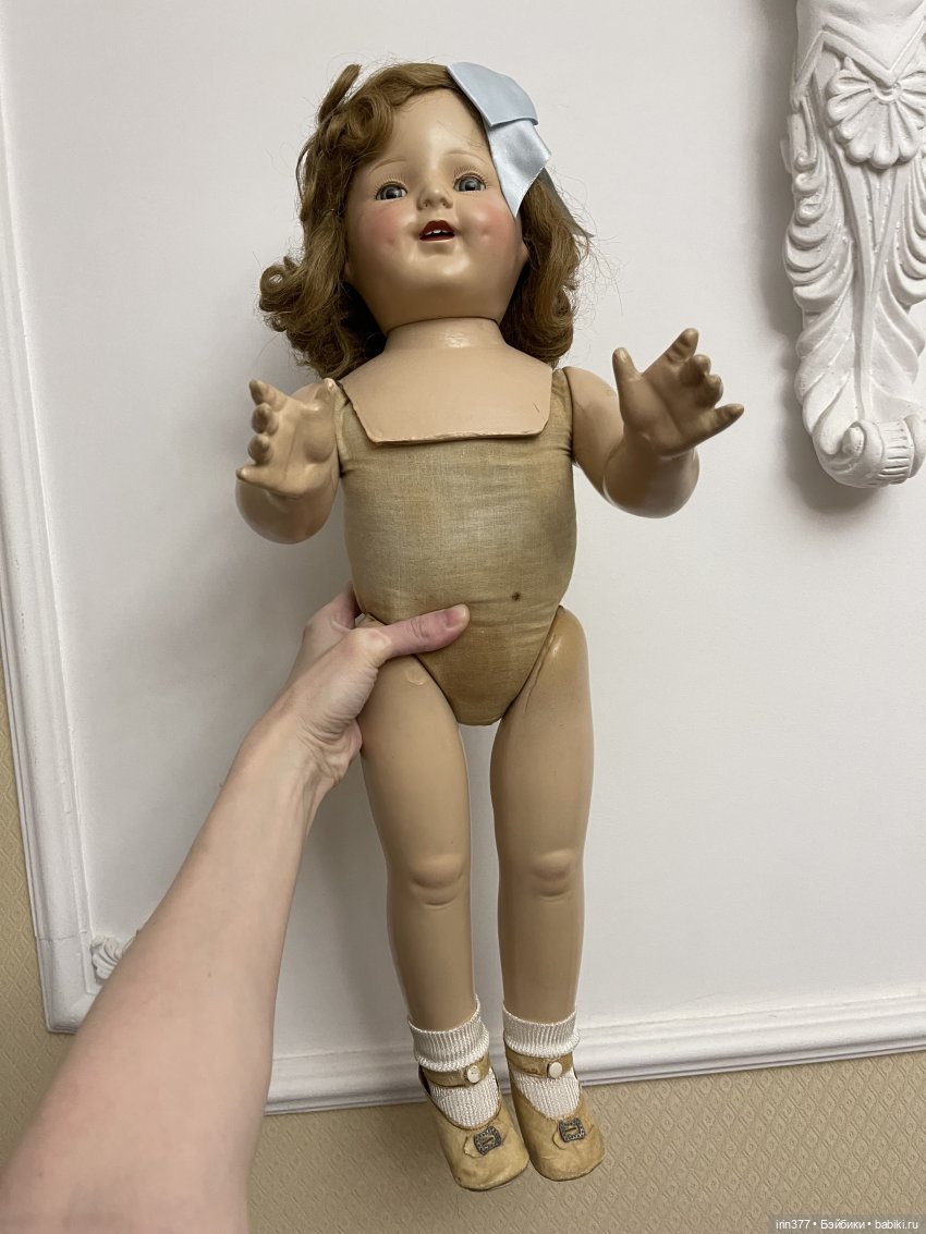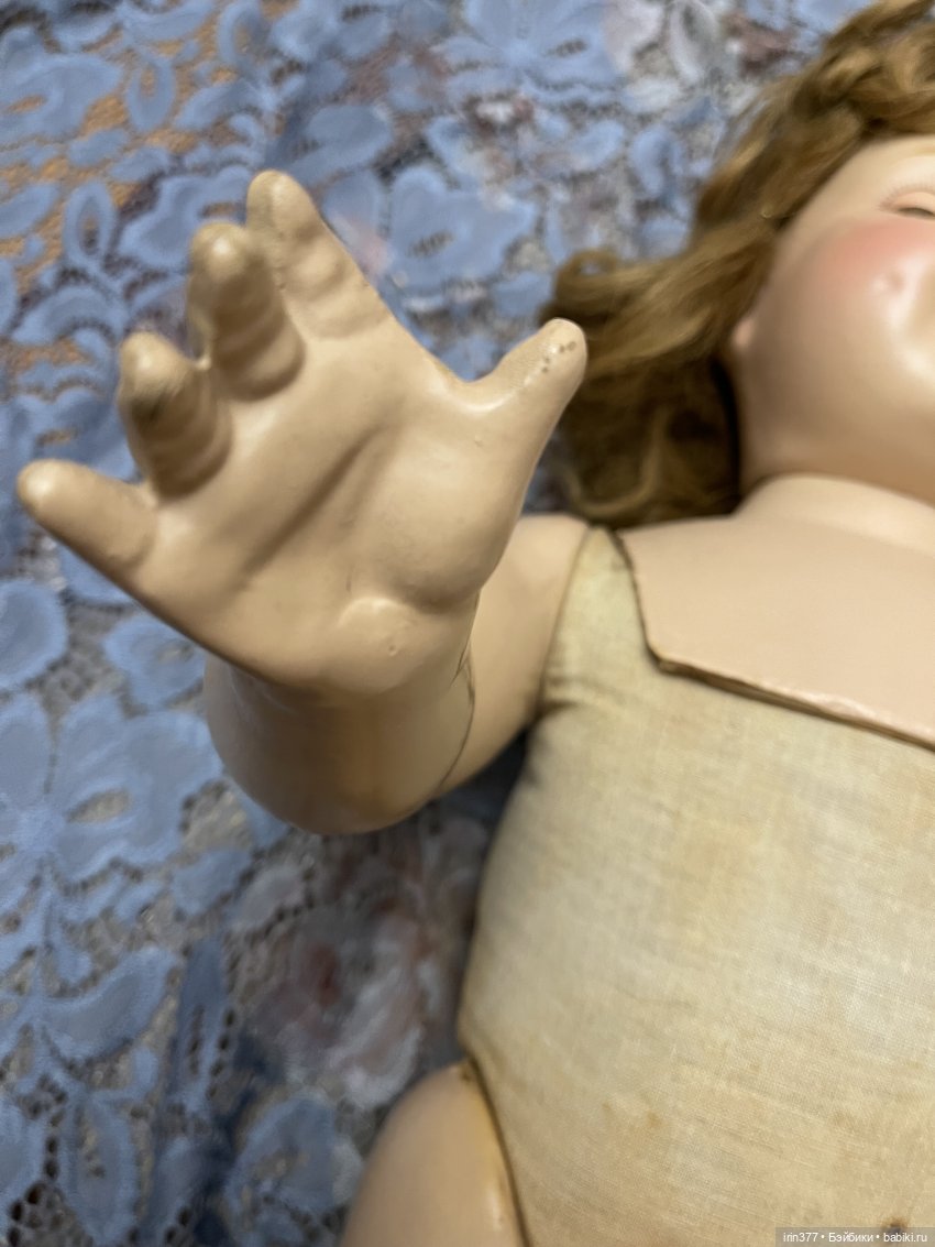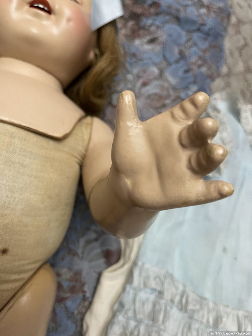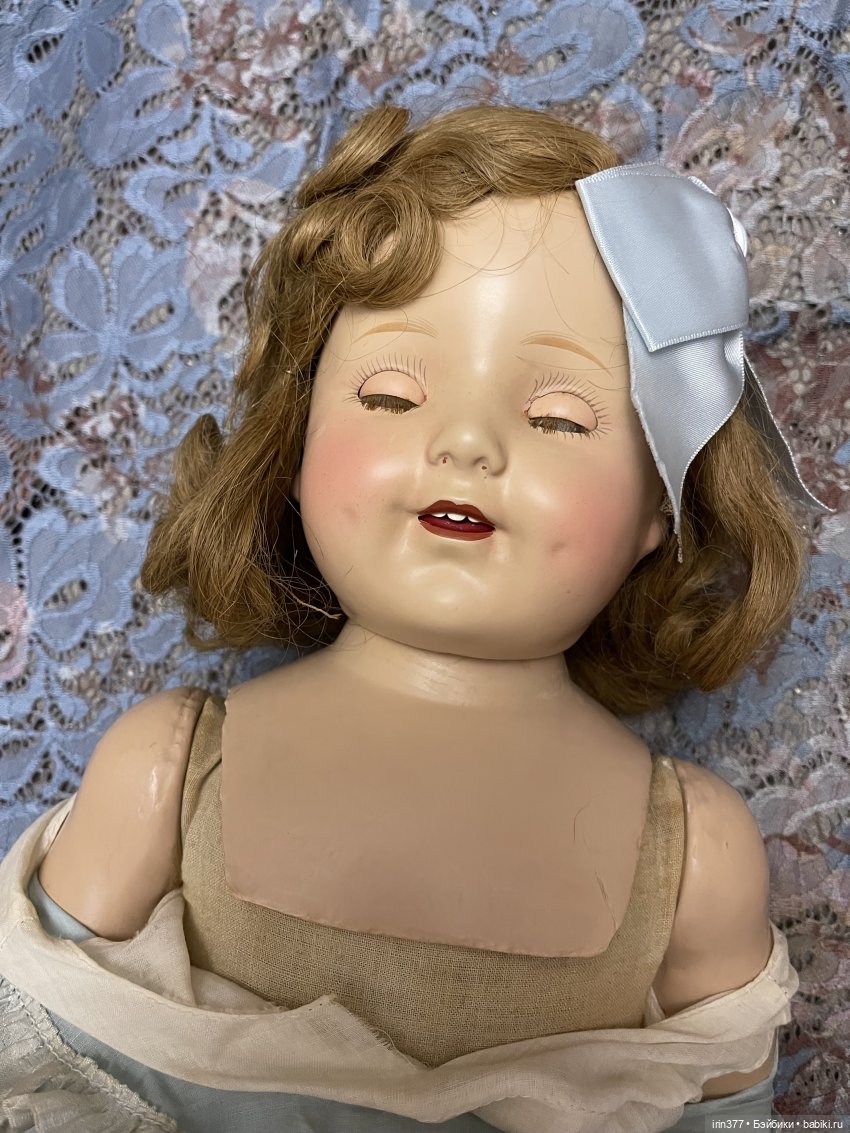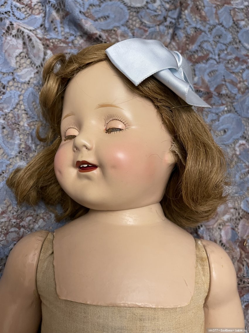 Композитная голова с пластиной на плечах, тканевое набивное тело, глаза спящие, язычок, 3 зубика, ямочки на щеках, парик натуральный волос, конечности композитные. Кукла во всем своем родном ( парик, платье, белье, обувь).