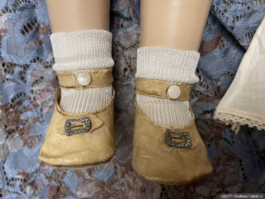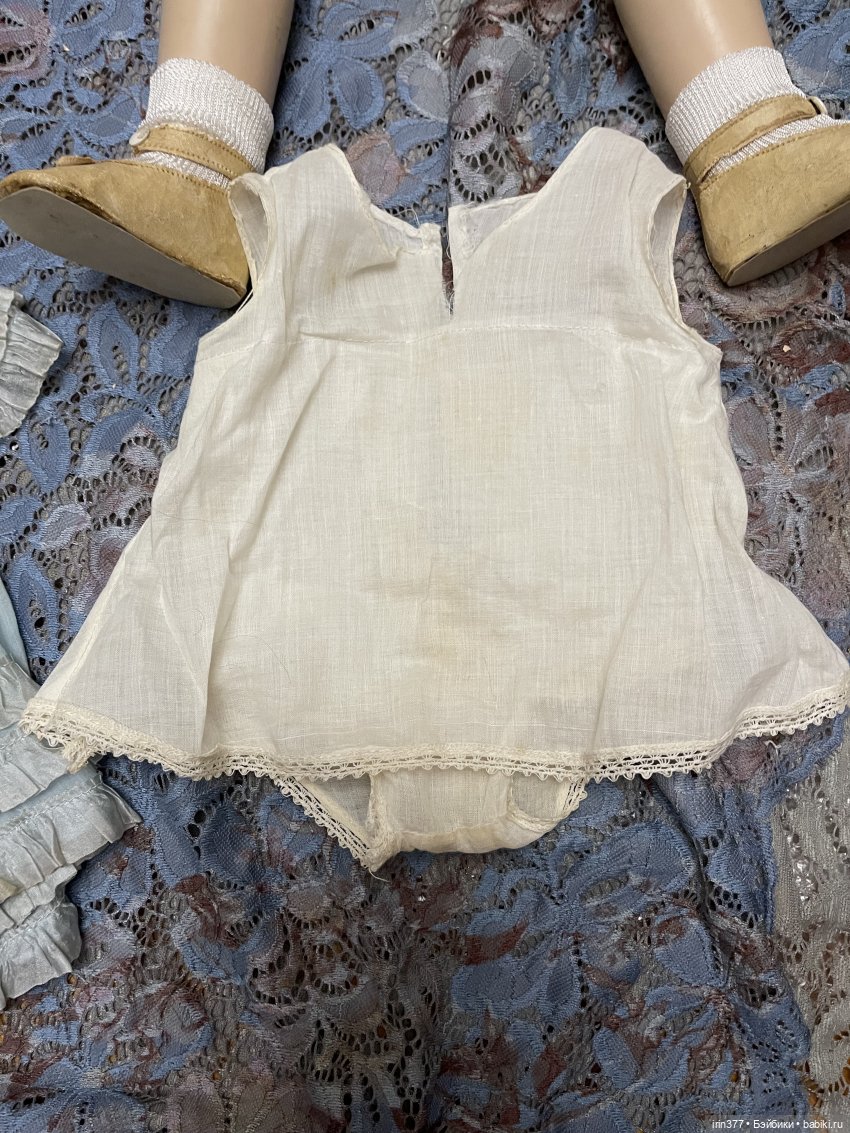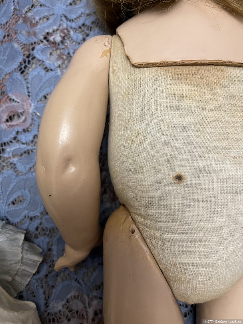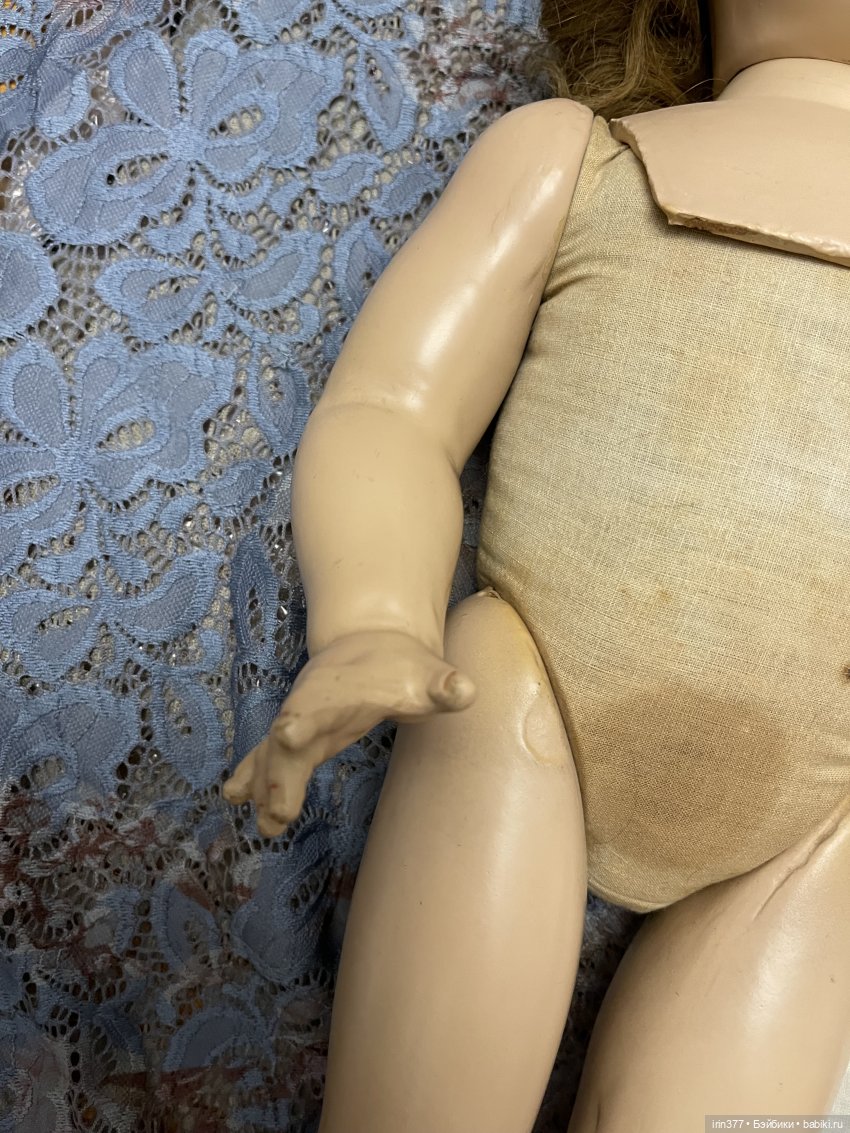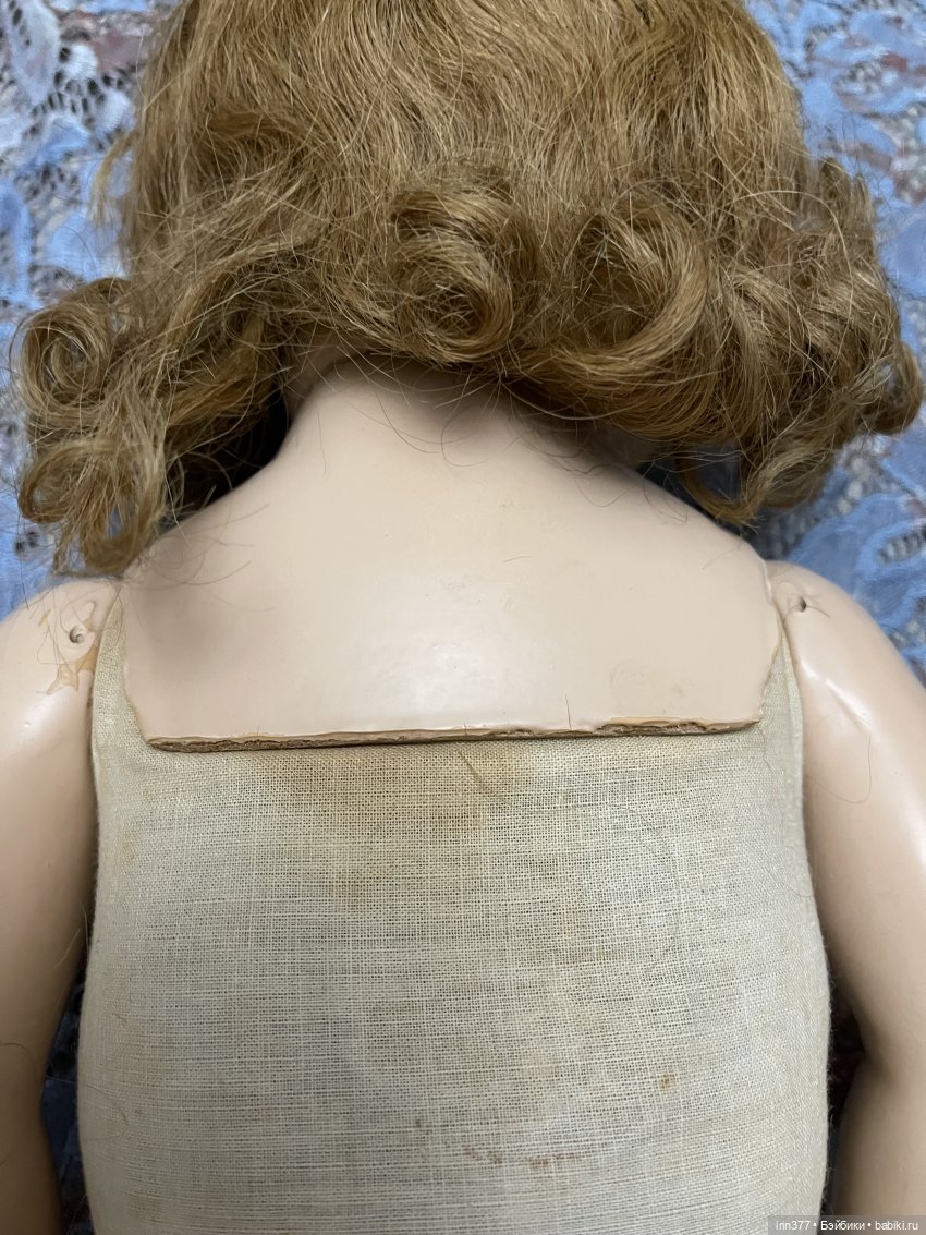 Композитная голова с пластиной на плечах, тканевое набивное тело, глаза спящие, язычок, 3 зубика, ямочки на щеках, парик натуральный волос, конечности композитные. Кукла во всем своем родном ( парик, платье, белье, обувь).