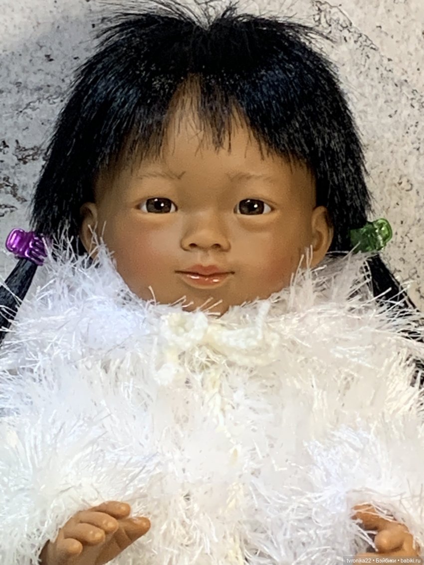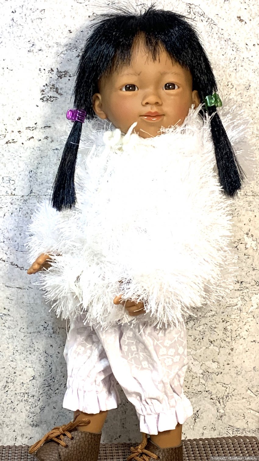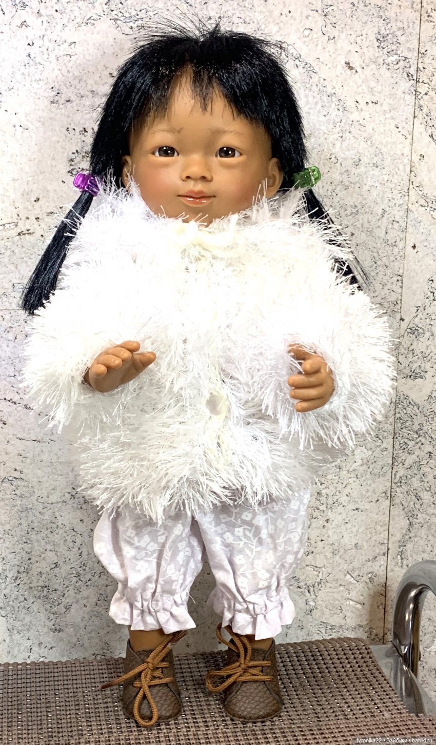 Куколка куплена уже не помню, когда. Из старых выпусков. Состояние отличное, стояла в застеклённом шкафу. Винил гладкий, мягкий, волосы прошиты густо.Одета в фирменный комплект для вихтелей, купленный мной в 2013 году у Юли OTTO.Старожилы бэйбиков и поклонники вихтелят её, наверное, хорошо помнят ) Вихтелей у меня уже давно не осталось, к сожалению, а этот комплект сохранился и прекрасно подошёл на Мариэтту. Комплект выполнен из х/б ткани, сшит безупречно. Состоит из: