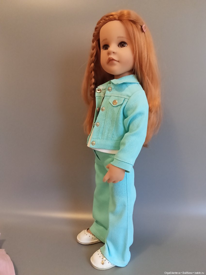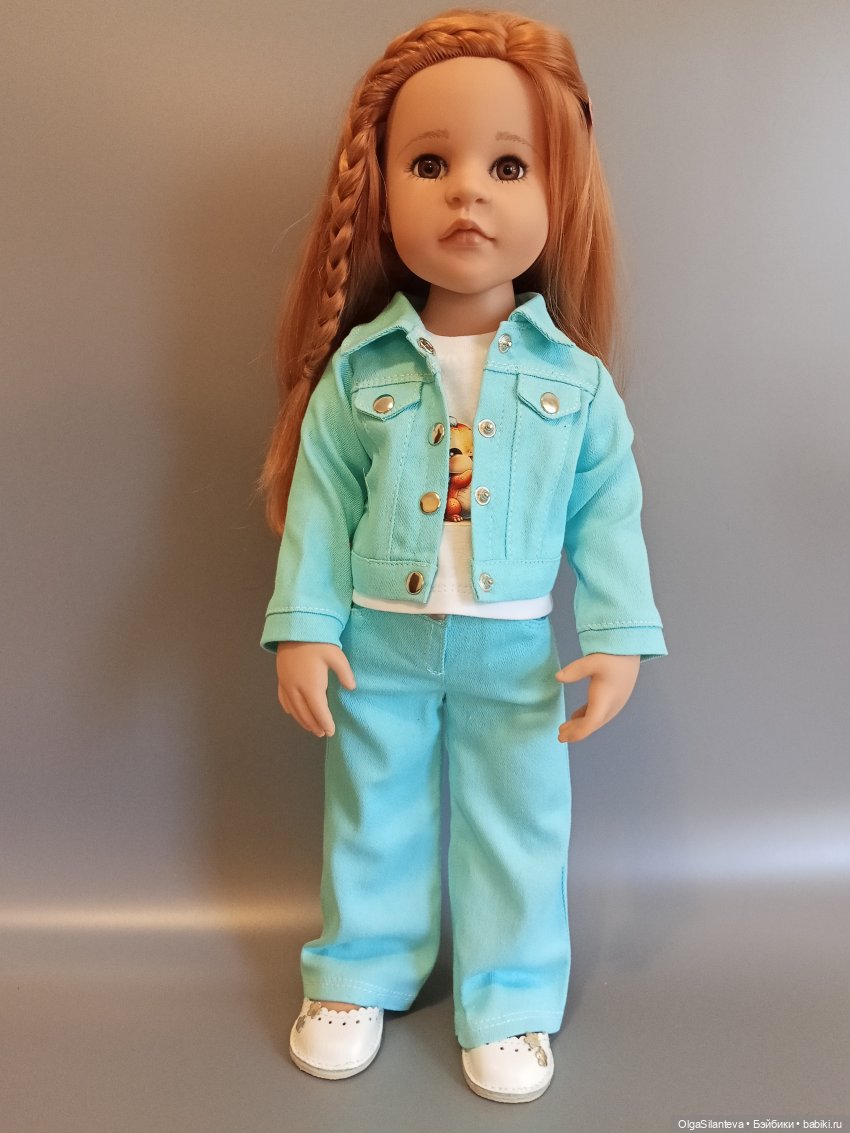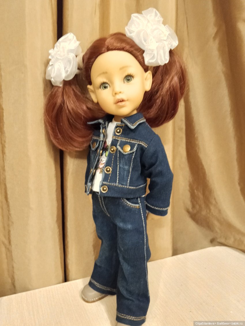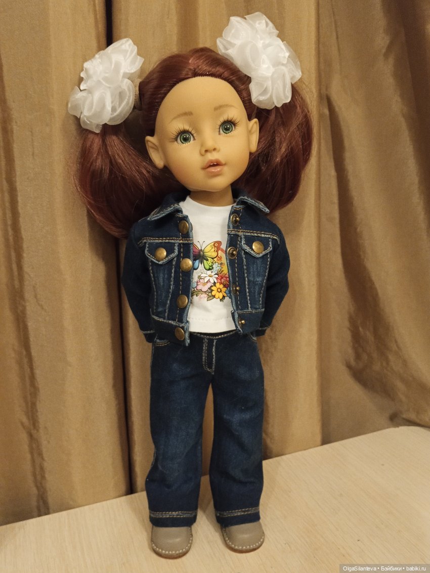Внутри белый джинсовый костюм, голубые джинсики и много разных трикотажных кофточек к ним на большую девочку готц