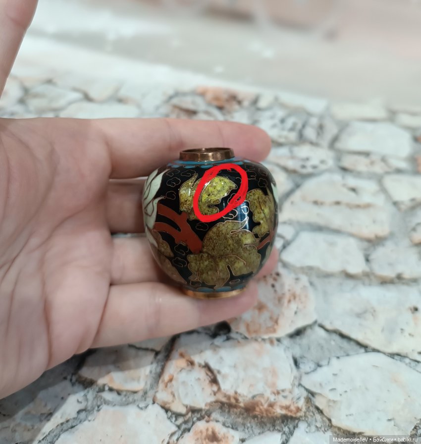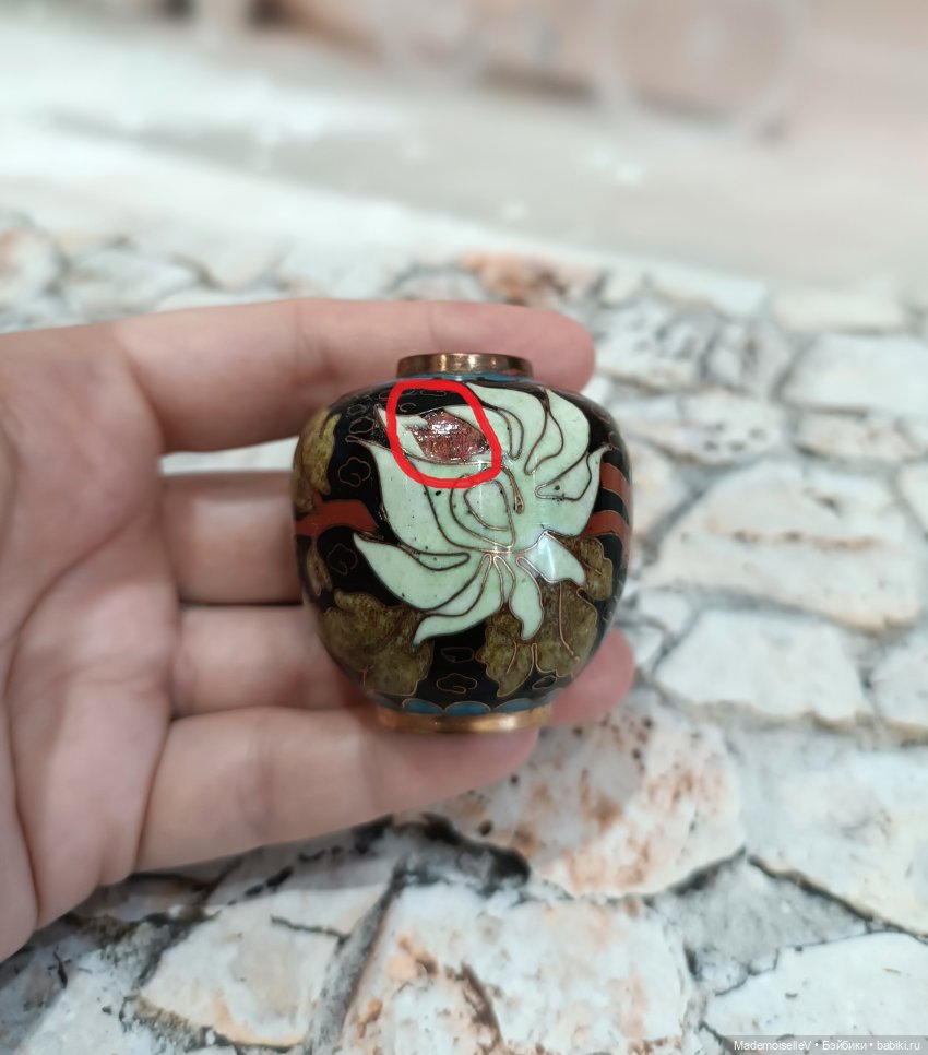 Два скола эмали, на фото отметила красным. Один скол на белом цветке, второй скол на золотисто-зеленом листке — замазан какой то твердой замазкой.